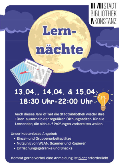 Um euch den letzten Boost zu geben, lädt die Stadtbibliothek Konstanz zu 3 Lernnächten ein: Abende voller Wissen, Energie und Gemeinschaft!