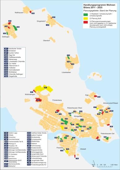 Zur besseren Einordnung wird ein Ampelsystem verwendet: Grün kennzeichnet Flächen, auf denen Wohnprojekte bereits fertiggestellt sind oder deren Planung so weit abgeschlossen ist, dass Wohnungsbau möglich ist. Gelb steht für Flächen mit geschaffenem Baurecht oder in konkreter Vorbereitung. Rot steht für frühe Planungsphasen. Die Darstellung macht sichtbar, dass sich die Entwicklung auf mehrere Stadtteile verteilt und Planung zunehmend in konkrete Umsetzung übergeht. Der Wohnungsbau konzentriert sich nicht auf einzelne Standorte, sondern erfolgt an verschiedenen Stellen im Stadtgebiet – ein zentrales Ziel des Handlungsprogramms Wohnen.