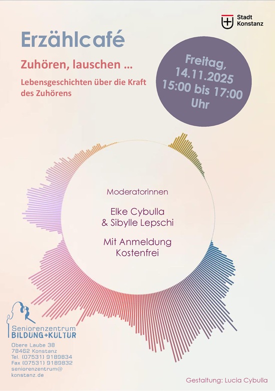Da die Teilnehmerzahl begrenzt ist, ist eine Anmeldung im Seniorenzentrum Bildung + Kultur, Telefon: 07531 9189834 oder seniorenzentrum@konstanz.de unbedingt erforderlich.