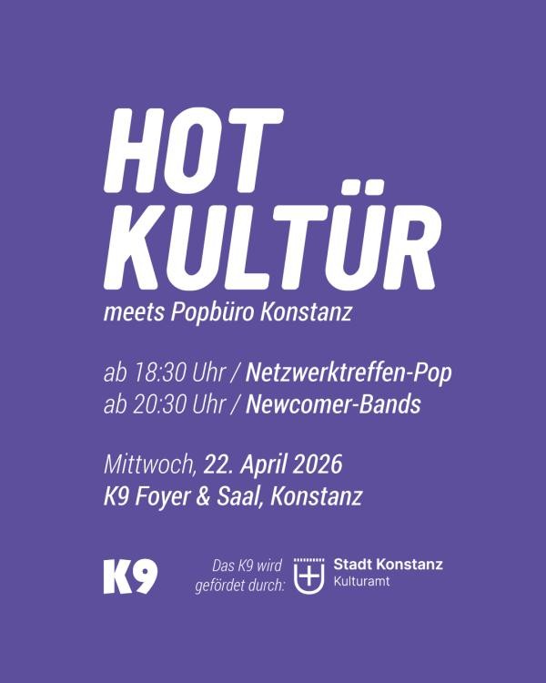 Die „Hot Kultür“-Spezial-Ausgabe im April kombiniert das dritte Popbüro-Netzwerktreffen mit einem Konzert aufstrebender Newcomer-Bands. Das "Popbüro Konstanz" fördert und unterstützt seit 2025 die Popularmusikszene in Konstanz und der Region Westlicher Bodensee und Hochrhein. In regelmäßigen Abständen bieten die Netzwerktreffen die Möglichkeit zum Austausch und dienen zugleich als Bestandsaufnahme. In den vorherigen Ausgaben wurde der Wunsch geäußert, Newcomern eine Plattform zu geben – genau DAS machen wir im Anschluss an das Treffen mit spannenden, aufstrebenden Bands aus der Region auf der K9-Bühne: NUDE (Alternative Rock) und My Memorial (Grunge). Wir hören euch!