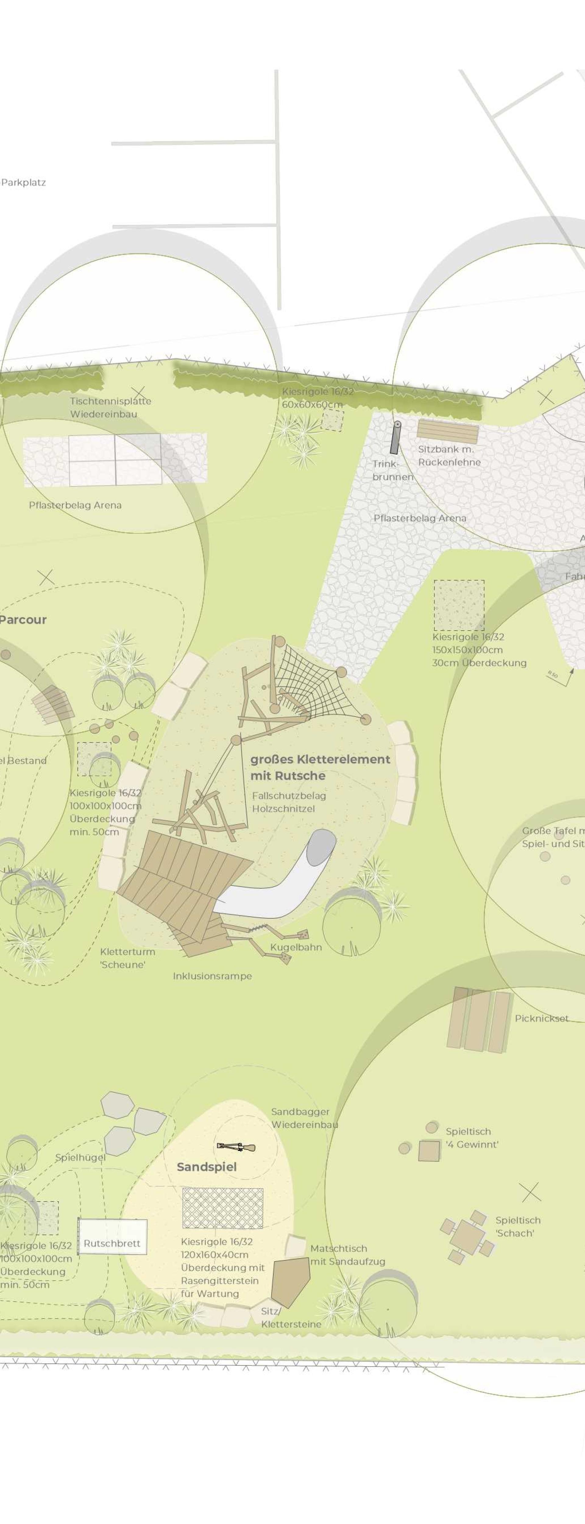 Barrierefreiheit, Spielwert und Aufenthaltsqualität im FokusSeit Anfang März baut die Stadt Konstanz den Spielplatz Kreuzlinger Straße in Stadelhofen um. Dafür hat sie in mehreren Beteiligungsrunden viele Anregungen aus der Bevölkerung berücksichtigt. Eine davon ist, den Platz nach einem einheitlichen Thema zu gestalten. Eröffnet wird der neue Platz voraussichtlich Mitte Mai. Der einzige, größere Spielplatz in Stadelhofen ist in die Jahre gekommen. Er liegt versteckt in zweiter Reihe zwischen Wohnbebauung und dem Lidl-Supermarkt. Das soll sich ändern. Ziel ist, den Spielplatz zu einem lebendigen Aufenthaltsort im Viertel zu gestalten. Wie sich die BewohnerInnen des Viertels diesen Ort vorstellen, haben mehrere BürgerInnen-Beteiligungsrunden gezeigt. Die Ergebnisse wurden im April 2024 öffentlich vorgestellt. Ein Überblick: Themenbasiert gestaltetThema des neuen Spielplatzes ist “Im Stadel“. Ein Stadel ist eine Scheune oder ein Heuschober auf einem Bauernhof. Bunte Schlangenlinien führen aus der Kreuzlinger Straße zum Spielplatz und verbinden die neuen Spielangebote. Sie sind dem Thema entsprechend aus Holz gefertigt. Dazu gehören unter anderem ein Klettergerüst, verschiedene Wipptiere und kleine Hütten. Die Bepflanzung mit verschiedenen Gräsern und „Heu“ ergänzt das Thema. Entlang der bunten Schlangenlinien gliedert sich die Spielplatzfläche in die Bereiche Fortbewegen, Verweilen und Spielen. FortbewegenEin Ziel der Stadt Konstanz ist, den Spielplatz so barrierefrei wie möglich zu gestalten. Der Platz wird für so viele Benutzende wie möglich zugänglich sein, unabhängig von Fähigkeiten und Einschränkungen. Pflasterbeläge, eine ebene Rasenfläche sowie Rampen und Stege gewähren Zugang zum Spielplatz und zu allen Spielgeräten. Dieses Vorgehen entspricht universellen Designprinzipien. VerweilenEin weiterer Fokus liegt darauf, den Aufenthalt durch Bepflanzung und üppige Grünflächen so angenehm wie möglich zu gestalten. Vielfältige Sitzmöglichkeiten und Ruhebereiche laden zum Verweilen ein. Dazu gehören Sitzbänke mit Rückenlehne, unter- und anfahrbare Spiel- und Picknicktische sowie Sitzmauern. Bäume spenden Schatten, und ein Trinkbrunnen verschafft Abkühlung und Erfrischung. SpielenFür Jung und Alt wird es 'Im Stadl' Spielangebote für verschiedene Fähigkeiten und alle Sinne geben. Im Randbereich laden Maltafeln dazu ein, kreativ zu werden. Eine Bühne bietet Raum für kleinere Veranstaltungen von und mit den Bewohnenden aus Stadelhofen. 4-Gewinnt- und Schachtische laden nicht nur zum Spielen, sondern auch zu neuen Begegnungen und Bekanntschaften ein.Im Zentrum des Spielplatzes steht ein Klettergerüst mit Rutsche. Hier lässt sich nicht nur klettern, sondern auch balancieren und hangeln. Die altersgerechten, teils auch anspruchsvolleren Aufgänge und unterschiedlichen Abgänge stellen den Kindern spielerische Herausforderungen.Ein separater Sandkasten mit Rutschbrett und Hügel lädt die Kleinsten ein. An sie richten sich auch die Kugelbahn, das Spielhaus, die Tischtennisplatte, die Schaukel und der Sandeltisch.