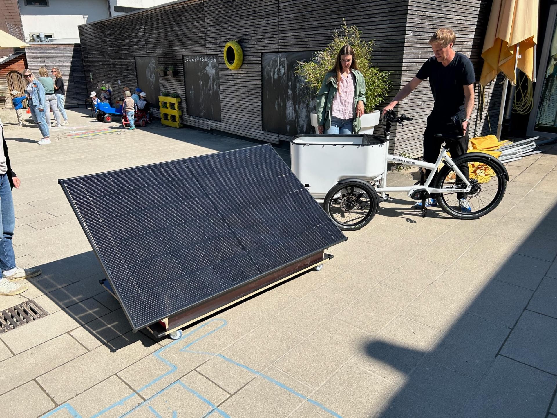 Bei dem kleinen Projekt galt es eine PV Lösung zu entwickeln, die einerseits zur Vermittlung der Technik verwendet werden kann und andererseits den Sicherheitsanforderungen im täglichen Betrieb des Kinderhauses entspricht. So entstand die Idee, eine Insellösung umzusetzen. Der gewonnene Solarstrom wird in einem Batteriespeicher gespeichert. Mit diesem kann das neue Lastenrad des Kinderhauses geladen werden. Da der Batteriespeicher mobil ist, kann er auch im Lastenrad untergebracht werden. Das Lastenrad wird nun noch mit einem Tischchen ausgestattet und soll so für Veranstaltungen mit Kühlbox, Kaffeemaschine und Musikanlage genutzt werden.