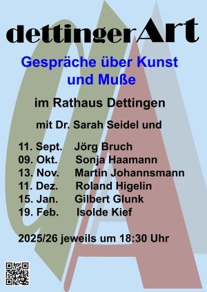 Aktuell ist im Sitzungszimmer im Rathaus Dettingen eine Werkauswahl der Dettinger-Wallhauser KünstlerInnen-Gruppe dettingerART zu sehen. Sie kann zu den Öffnungszeiten der Ortsverwaltung besichtigt werden. Parallel zur Ausstellung und zur Bereicherung des Dettinger-Wallhauser Kulturprogramms wurde das Veranstaltungs-format Im Dialog mit dettingerART – Gespräche über Kunst und Muße ins Leben gerufen.Im Dialog mit dettingerART sind moderierte Gespräche mit den Künstlerinnen und Künstlern. Sie sollen dazu beitragen über Kunst ins Gespräch zu kommen, Menschen für Kunst zu begeistern und ohnehin Begeisterte miteinander ins Gespräch zu bringen; außerdem sollen sie jungen KünstlerInnen die Möglichkeit eröffnen, sich der Gruppe anzunähern. Im Anschluss an jedes Gespräch besteht die Möglichkeit bei einem Glas Saft oder Sekt auch miteinander in einen Dialog zu treten.Die Gespräche finden jeden zweiten Donnerstag im Monat, ab 18:30 Uhr im Rathaus Dettingen statt.