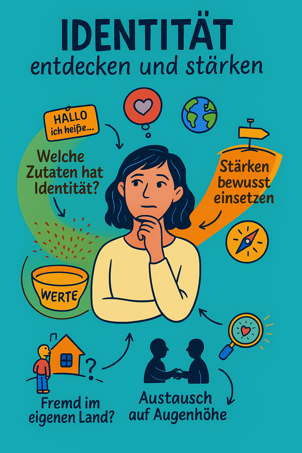 In einer unterstützenden Atmosphäre suchen die Teilnehmenden Antworten auf wichtige Fragen: Wer war ich, wer bin ich geworden? Was macht unsere Identität aus? Wie fühlt es sich an, in einem neuen Land anzukommen? Kann ich mir vertrauen und mich akzeptieren? Kann man fremd im eigenen Land sein? Die Veranstaltung trägt dazu bei, die eigene Identität im Kontext von Migration anhand verschiedener Mechanismen verstehen zu lernen, um das eigene Selbstbewusstsein zu stärken. Methoden wie die Übung „Die Geschichte meines Namens“ oder Rollenspiele verhelfen dazu, Erfahrungen auszutauschen, Perspektiven von anderen einzunehmen und eine Gemeinschaft zu bilden, die sich gegenseitig unterstützt.