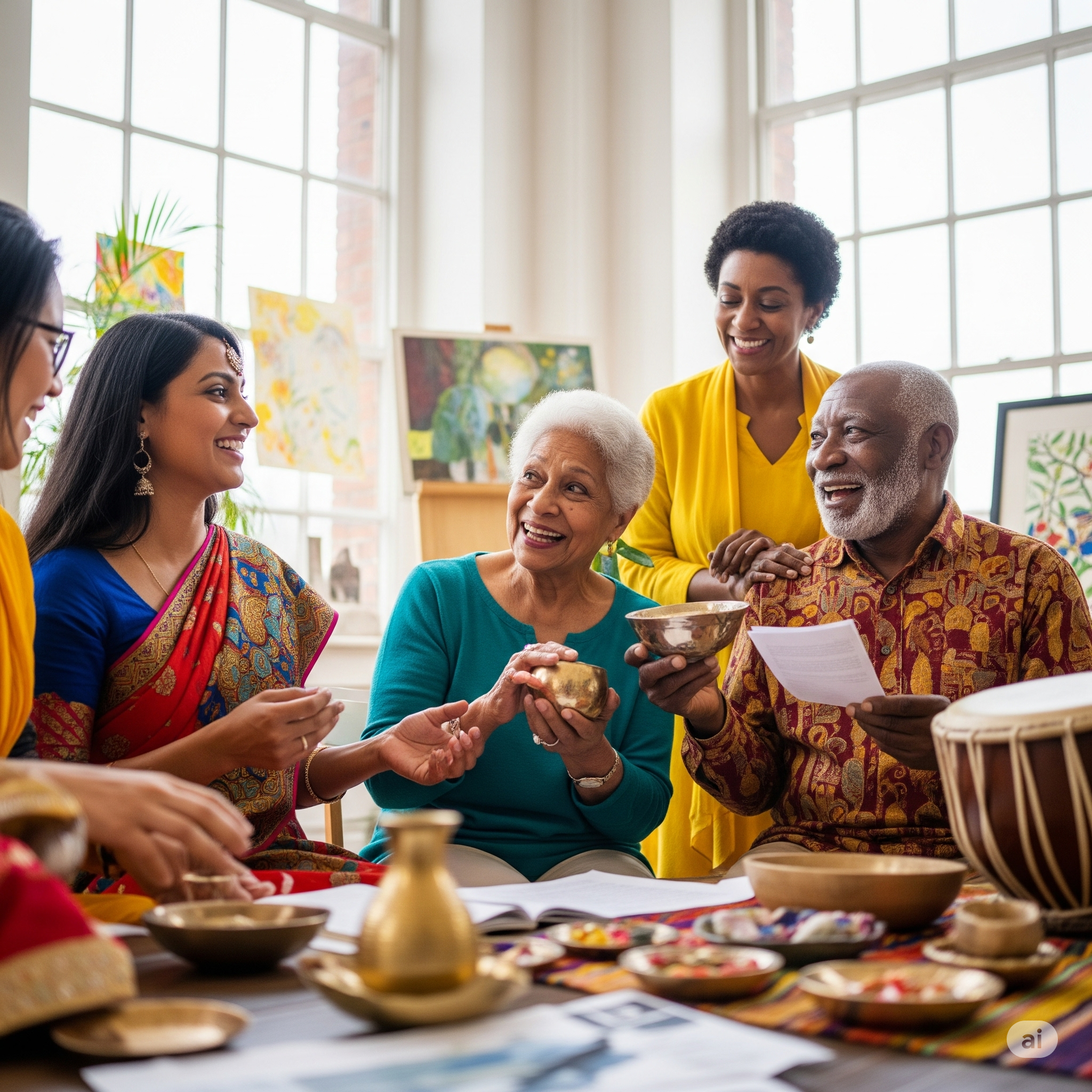 Menschen mit Wurzeln in verschiedenen Ländern sind an diesem Nachmittag dazu eingeladen, von feierlichen Traditionen ihrer Kulturen zu erzählen. Was wird in welcher Kultur gefeiert? Welche Rituale werden bei besonderen Anlässen praktiziert? Ob religiöse Feste, familiäre Bräuche oder landestypische Feiertage, jede Geschichte ist willkommen erzählt zu werden! In einer gemütlichen Atmosphäre kommen die Teilnehmenden ins Gespräch über das, was uns verbindet – die Freude am Feiern, Zusammensein und die Vielfalt kultureller Ausdrucksformen. Untermalt wird der Nachmittag von fröhlicher traditioneller Musik aus verschiedenen Regionen der Welt. Es gibt kleine Köstlichkeiten, die den Austausch noch genussvoller machen. Zum Abschluss wird gemeinsam eine kreative Erinnerung geschaffen: Ein buntes Kunstwerk, das noch lange an den Nachmittag und das Miteinander erinnern soll.