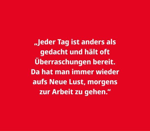 Die kommt aus der Arbeit selbst. Jeder Tag ist anders als gedacht und hält oft Überraschungen bereit. Da hat man immer wieder aufs Neue Lust morgens, zur Arbeit zu gehen. Es wird nie langweilig.
