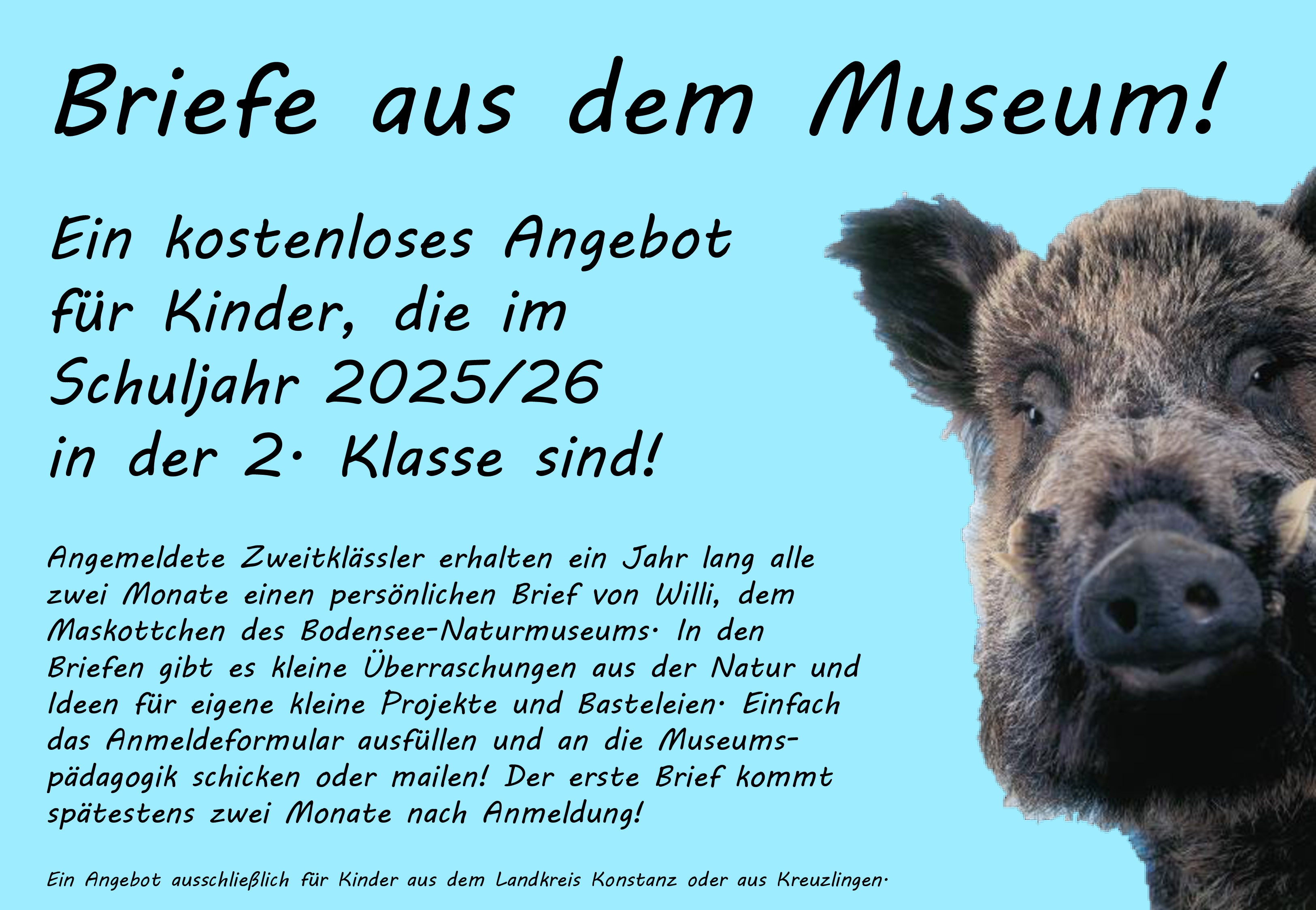 Willi, das Maskottchen des Bodensee-Naturmuseums, liebt es Briefe zu schreiben und mit den kleinen Besuchern des Museums in Kontakt zu bleiben! Einfach das Anmeldeformular (114 KB) ausfüllen an muspaedbnm@konstanz.de schicken und ab geht die Wildschwein-Post.