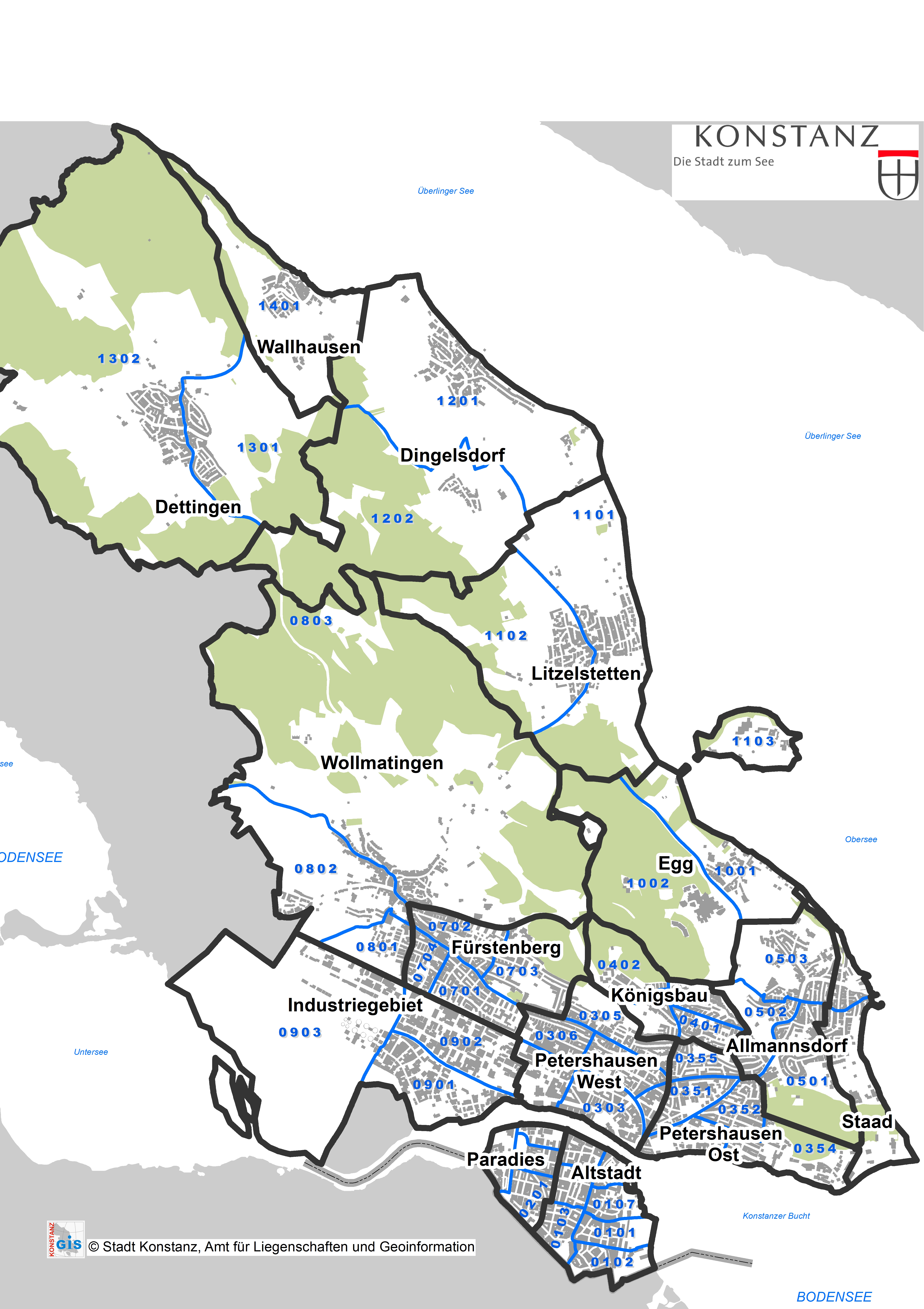 010 Altstadt020 Paradies030 Petershausen-West035 Petershausen-Ost040 Königsbau050 Allmannsdorf (1915 eingemeindet)060 Staad070 Fürstenberg080 Wollmatingen (1934 eingemeindet)090 Industriegebiet100 Egg110 Litzelstetten (1971 eingemeindet)120 Dingelsdorf (1975 eingemeindet)130 Dettingen (1975 eingemeindet)140 Wallhausen (1975 eingemeindet)
