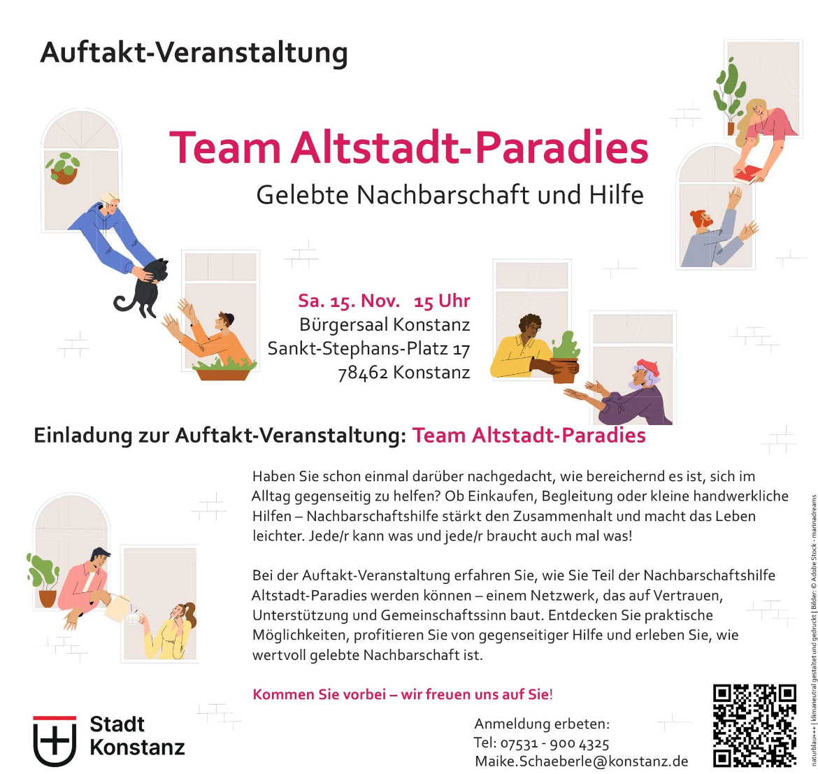 Anmeldungen bitte telefonisch 07531/900-4325, per Mail an Maike.Schaeberle@Konstanz.de oder unter konstanz.de/team-altstadt-paradies