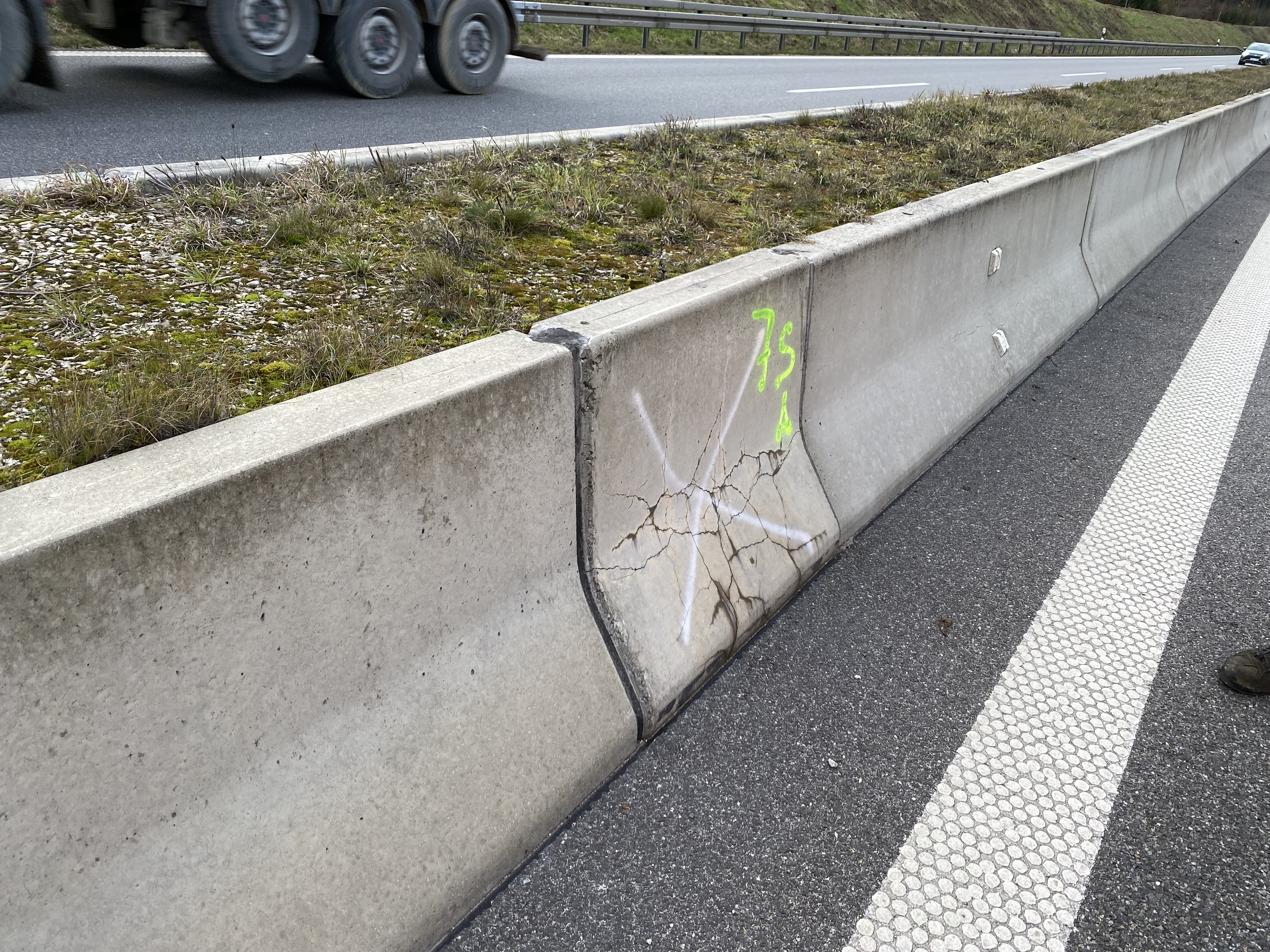 Auf einer Länge von knapp 350 Metern müssen insgesamt 36 Elemente freigelegt, ausgebaut und ausgetauscht werden. Da die 3.50 Meter langen Betonschutzwände etwas mehr als zwei Tonnen wiegen, wird zum Abtransport ein Mobilkran eingesetzt, welcher die Wände auf einen Tieflader hebt.