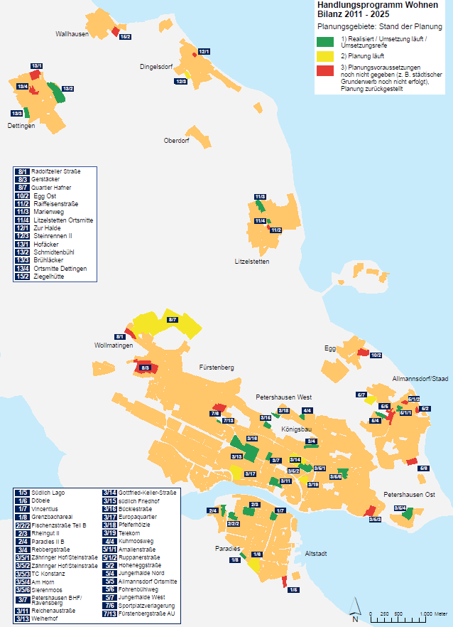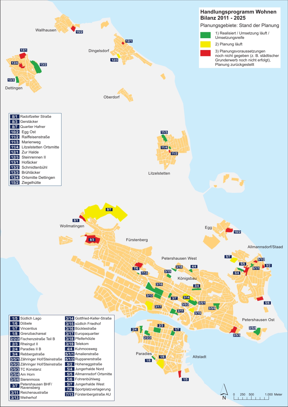 Wie gelingt es, ausreichend Wohnraum für alle zu schaffen? Das Handlungsprogramm Wohnen der Stadt Konstanz gibt Antworten auf diese zentrale Frage. Die Stadt verfolgt das Ziel, Konstanz für alle Bevölkerungsschichten attraktiv und lebenswert zu halten. Im Fokus steht, neue Wohnbauflächen zu entwickeln, Baurecht zu schaffen und konkrete Projekte in verschiedenen Stadtteilen umzusetzen. Die Karte anbei veranschaulicht die Wohnbauflächen des Handlungsprogramms Wohnen mit ihrem jeweiligen Entwicklungsstand. Sie bietet einen kompakten Überblick darüber, wie sich der Wohnungsbau im gesamten Stadtgebiet entwickelt und wo Konstanz aktuell steht.