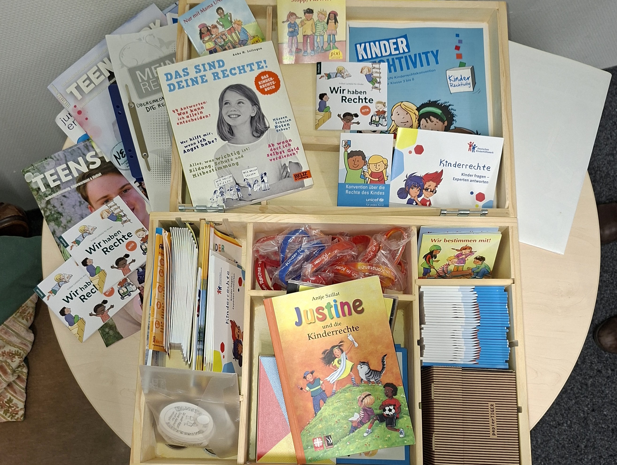 Die Kinder- und Jugendbeteiligung bietet einen Kinderrechte-Koffer zur Ausleihe an. Der Koffer enthält Spiele, Bücher, Karten und Anregungen, um Kinder spielerisch über ihre Rechte zu informieren.