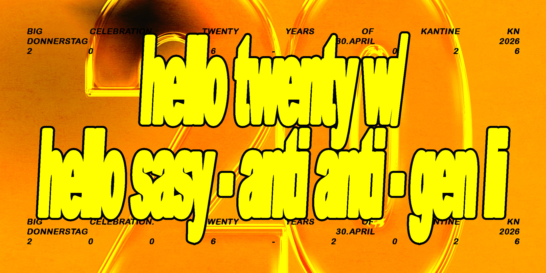 Das Jubiläum am 30. April wird mit einer vielseitigen Clubnacht gefeiert, die den Spirit der Kantine KN aufgreift und zugleich den Blick nach vorne richtet. Ein Programm am Puls der Zeit sorgt dafür, dass sich sowohl langjährige WegbegleiterInnen als auch ein junges, feierfreudiges Publikum angesprochen fühlen. Für die Clubnacht hat die Kantine KN neben den lokalen Residents ANTI ANTI und GEN LI auch HELLO SASY gebucht.