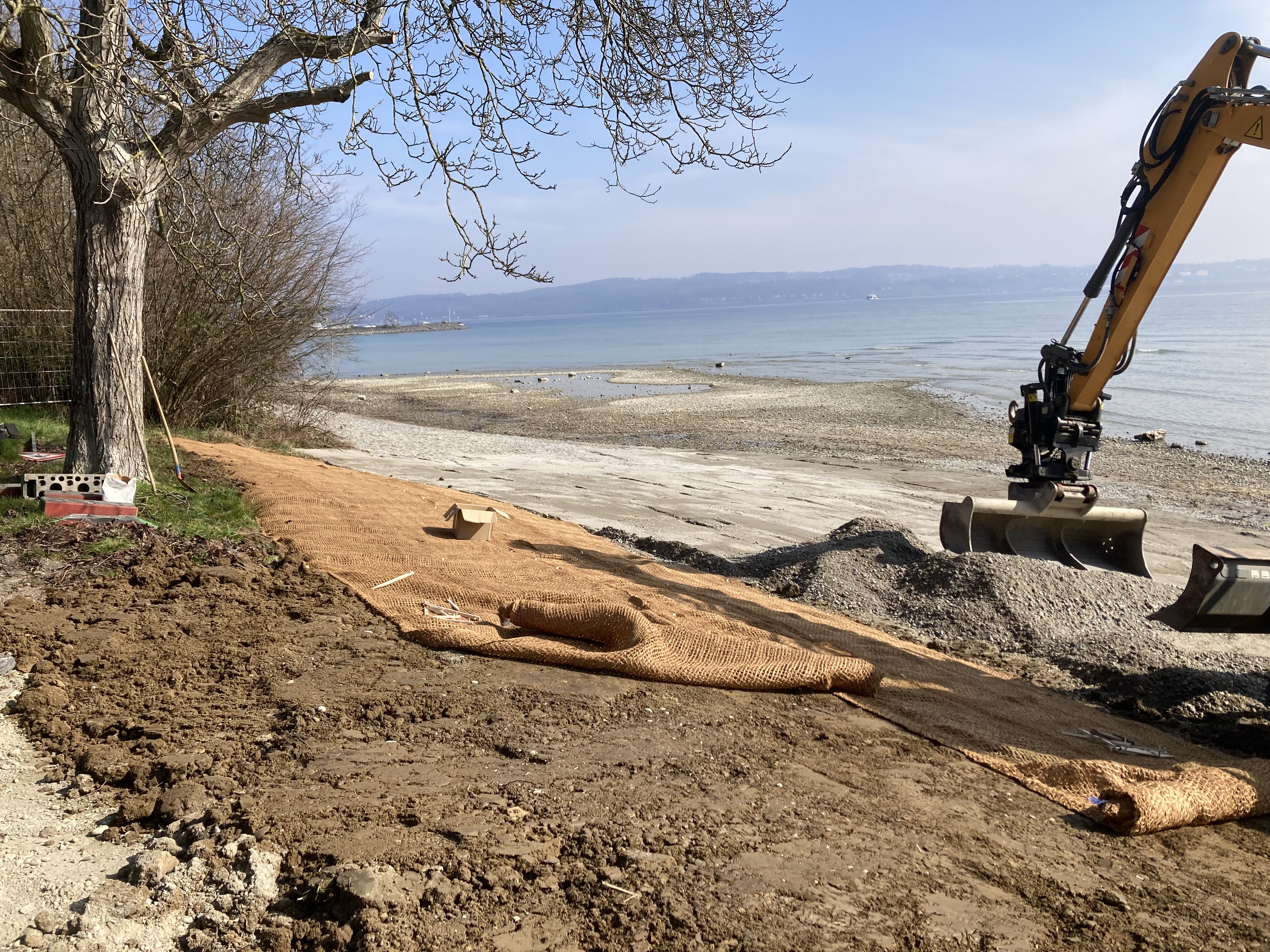 Zur kurzfristigen Wiederfreigabe des Seezugangs wurde eine provisorische Böschungssicherung hergestellt. Diese erfolgte mittels engmaschiger Naturmatten, die den Bereich nun stabilisieren. Bis die Grasnarbe vollständig verwurzelt ist und die Matten die nötige Stabilität erreicht haben, bleibt der Bereich durch Bauzäune gesichert.