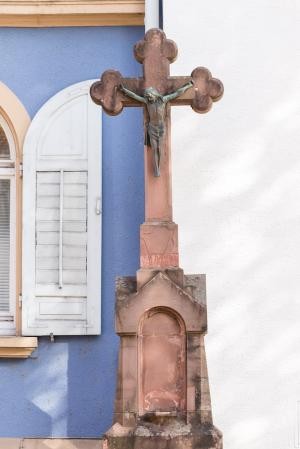 Aufgrund von Baumaßnahmen am ursprünglichen Standort des Wegkreuzes wurde das Kruzifix in den 1980er-Jahren von der Ecke Gottlieber Straße/ Brüelstraße in die Brüelstraße versetzt. Möglicherweise kennzeichnete das Kreuz den Weg zwischen der St.-Stephans-Kirche und der St.-Martins-Kapelle. Das dreieinhalb Meter hohe Kruzifix aus rotem Sandstein wurde von der Bürgerschaft Paradies gestiftet. Seine Inschrift „Oh Ihr alle, die Ihr auf dem Wege vorübergehet, seid aufmerksam und sehet: ob ein Schmerz seinem Schmerze gleiche" lädt die Vorbeigehenden zur Andacht ein.
