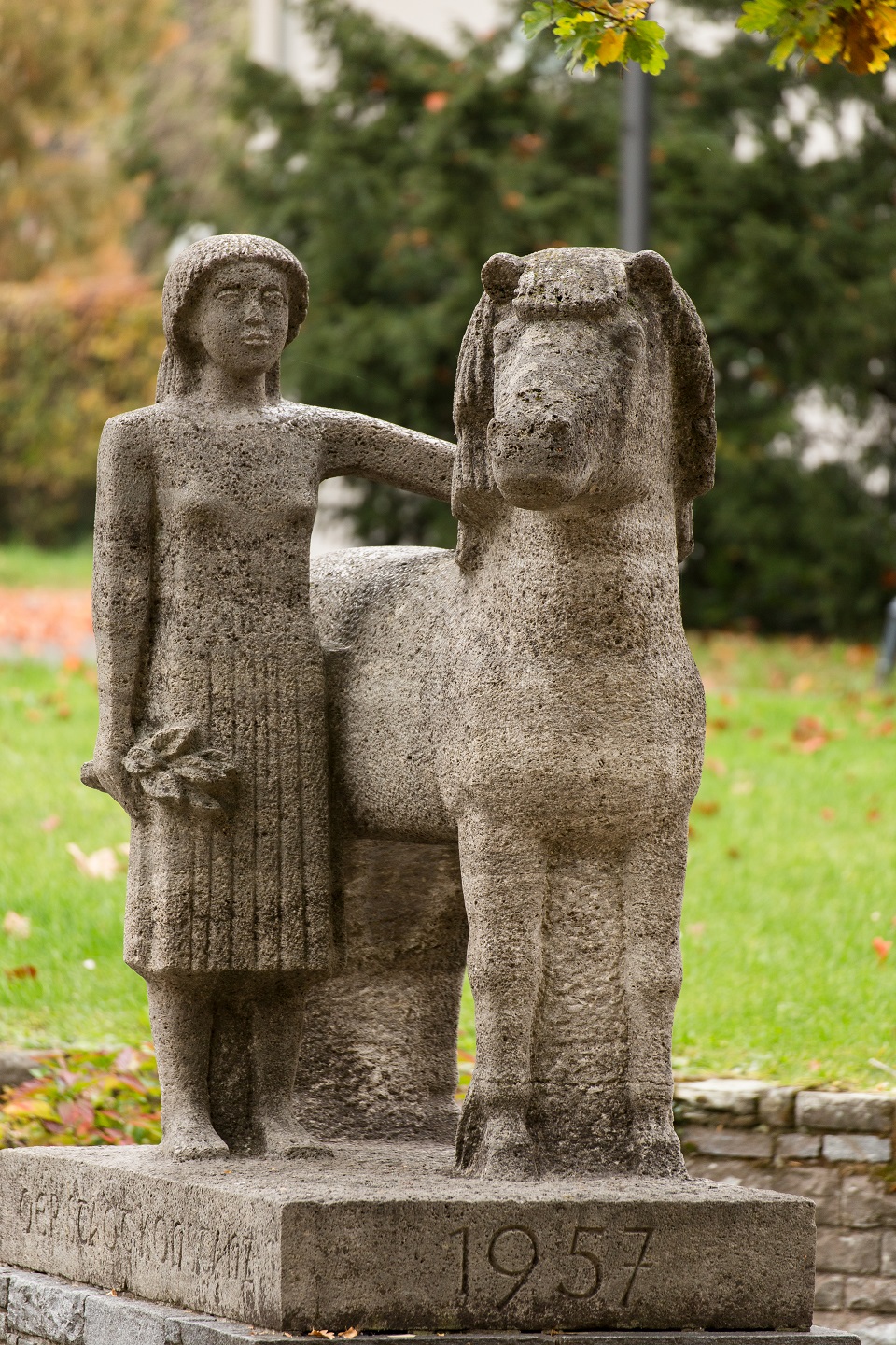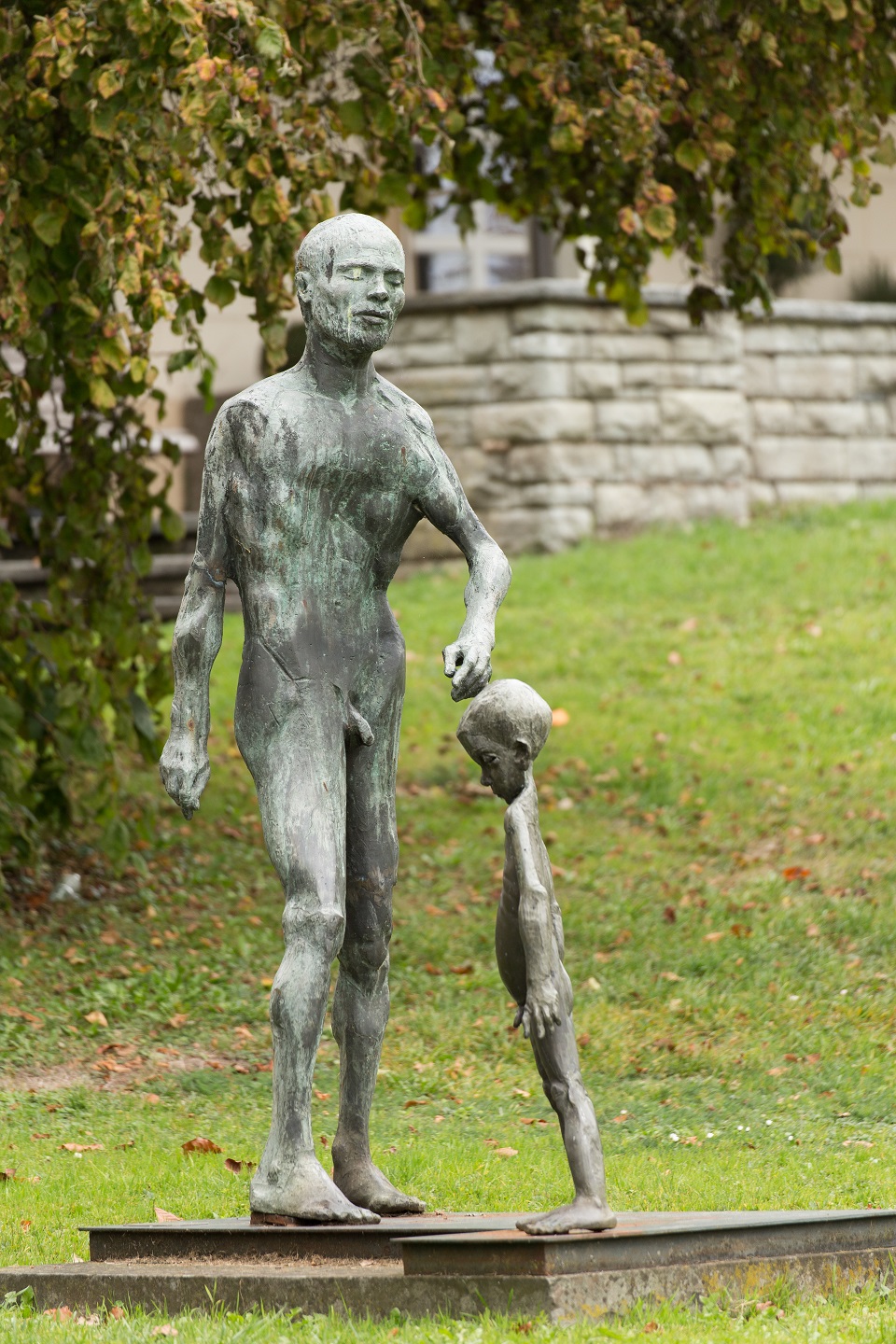 Die Figurengruppe "Vater und Sohn" wurde 1986 im hinteren Rathaushof aufgestellt. Schon damals war klar, dass dies nicht der endgültige Standort für die Plastik sein wird, da sich der Hof des Rathauses in Umgestaltung befand. Heute steht die Skulptur des renommierten bulgarischen Künstlers Iwan Slawov an der Seestraße vor der Villa Prym. Die Figur des Vaters misst 1,64 m und die des Sohnes 0,85 m. Slawov fertigte die Figurengruppe aus Bronze.