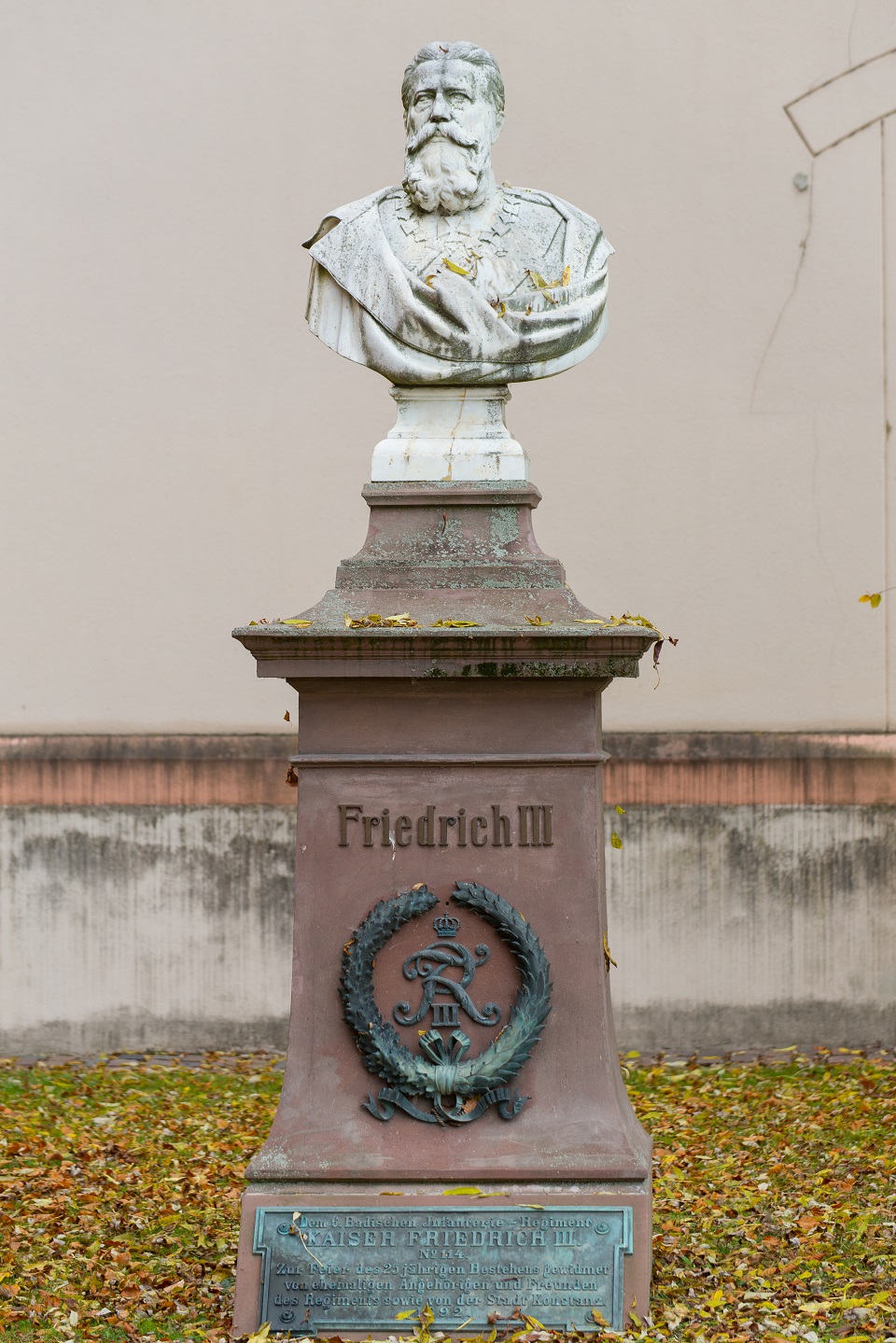 Die Büste aus carrarischem Marmor wurde 1892 von ehemaligen Angehörigen, Freunden und der Stadt Konstanz dem "6. Badischen Infanterie-Regiment Nr. 114" zur Feier des 25-jährigen Bestehens gestiftet. Aufstellung fand das Werk von Hans Baur am damals noch nicht so verkehrsreichen Sternenplatz in der Umgebung des Offizierskasinos, des Kasernentors und der Kaserne des 114er Regiments. Der rote Sandsteinsockel trägt die Inschrift "Friedrich III." über dem Signet des Kaisers in Siegeskranz aus Lorbeer und Eiche.