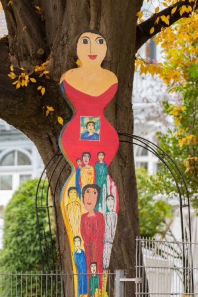 Die Beschriftungen der Bäume im Stadtgarten und an der Seestraße gehören zu einer dreiteiligen Arbeit der Künstlerin Rebecca Koellner, die sich in diesem Werk auf den Philosophen Michel de Montaigne (1533 - 1592) und die Schriftstellerin Virginia Woolf (1882 - 1941) bezieht. Von beiden ließ sich die Schriftstellerin zum Thema Gewohnheit inspirieren. Koellner beschäftigte sich in ihrer Arbeit mit der Frage, wie der Mensch seine Umgebung wahrnimmt und ob der gewohnte Blick auf alltägliche Dinge unsere Sicht verändert. Ebenso wie Montaigne hinterfragt Koellner unsere Haltung und Achtung vor Menschen, Tieren und Pflanzen. Die Textzeilen auf den beschrifteten Baumstämmen entstammen den literarischen Werken von Montaigne und Woolf. Die Beschriftungen wurden mit Hilfe einer Schablone auf die Bäume aufgetragen. Als Farbe diente hierzu „Arbo-Flex", ein Pflanzenstärkungsmittel.
