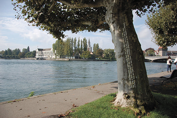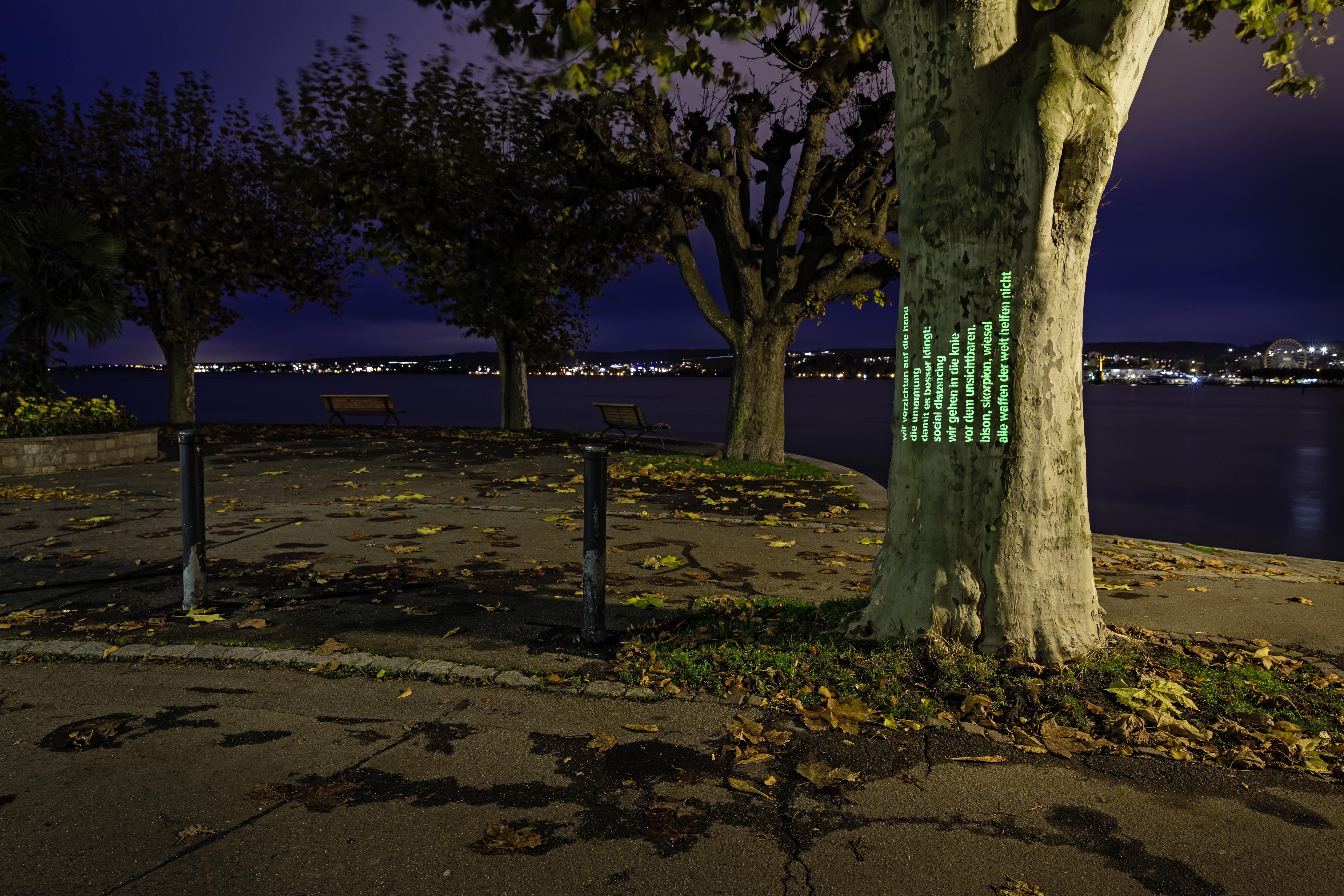 Die Künstlerin Rebecca Koellner hat auf der innerstädtischen, beliebten Flaniermeile „Seestraße“ in Konstanz Platanenbäume mit ihren lyrischen Texten beschriftet. Ihre Arbeit hat sie "tag und nacht" genannt, da zu allen Tageszeiten die Texte gut lesbar sind. Die verwendeten nachleuchtenden Farben können das Licht aufnehmen und wieder abgeben. Das verwendete Material schadet den Bäumen nicht. Das Kunstprojekt stellte Koellner Anfang November 2020 fertig.