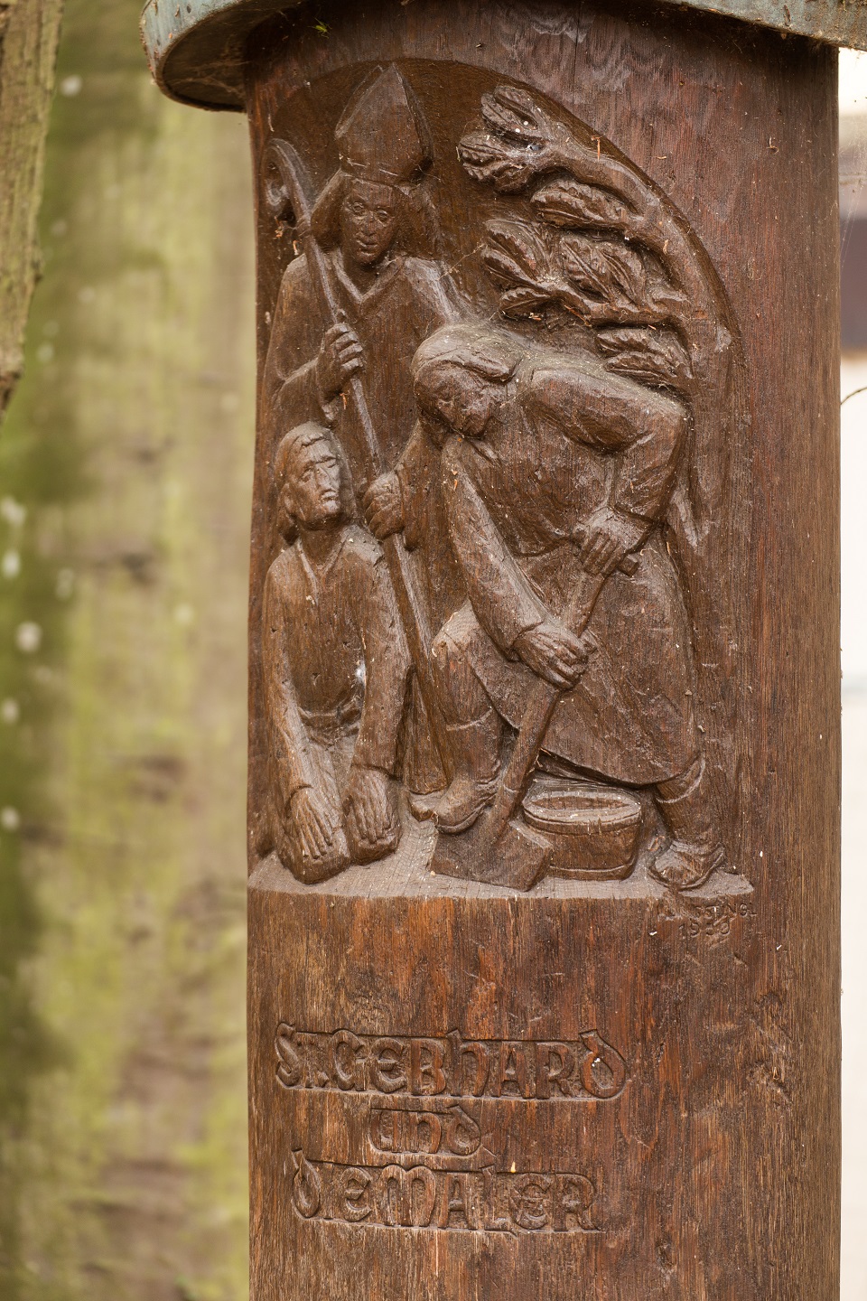 Der von Hans Stingl 1950 gefertigte Brunnen zeigt als Holzrelief einen Ausschnitt aus der Legende über den Bischof Gebhard und die Maler. Der Legende zur Folge hätten die Maler beim Bau der Kirche Petershausen ihre Farben im Boden vergraben, um die Arbeit ruhen lassen zu können. Als der Bischof den Stilstand der Arbeiten bemerkte, erfragte er den Grund bei den Malern, die auf das Fehlen der Farben verwiesen. Daraufhin geleitete der Bischof die Maler genau zu dem Punkt an dem die Farben vergraben waren und stieß seinen Stab in den Boden. Nachdem die Maler ihre Farben wieder ausgegraben hatten, sprudelte aus dem Loch Wasser, sodass seit 1105 an dieser Stelle ein Brunnen Trinkwasser förderte. Der heutige Gebhardsbrunnen steht nicht mehr an seinem ursprünglichen Standort und nur noch die Inschrift und das Relief in der zwei Meter hohen Säule erinnern noch an diese alte Legende.