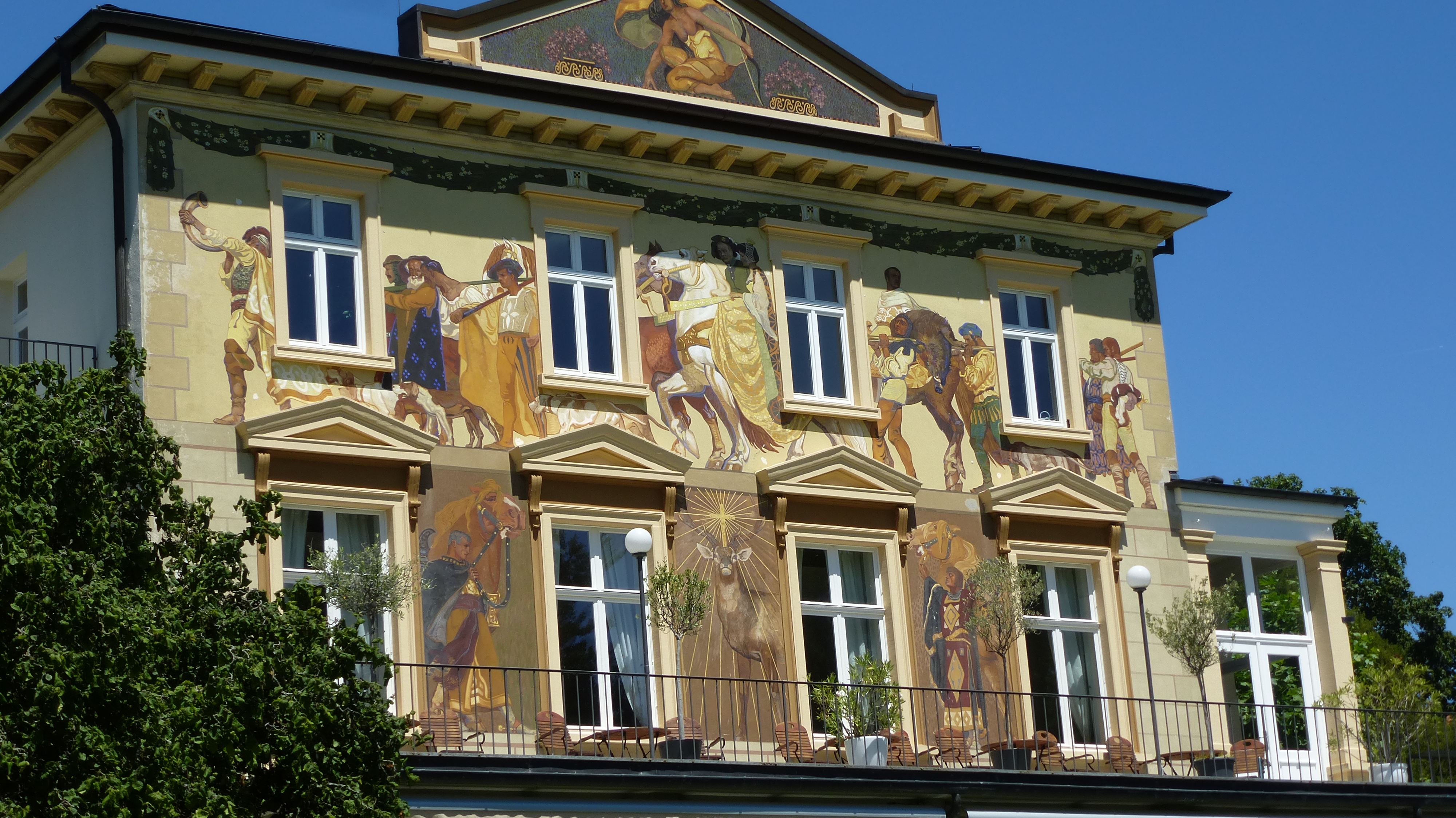 Die Villa Prym wurde 1876 erbaut und bereits 20 Jahre nach der Erbauung an den, aus einer berühmten Knopfabrikanten Familie stammenden, Gustav Prym verkauft. Dieser kaufte es als Sommerhaus und modernisierte es so umfassend, dass es heute seinen Namen trägt. Zu den Modernisierungen gehören auch die Wandmalereien auf der zur Seeseite ausgerichteten Fassade. Mit diesen wurde 1908 der Karlsruher Kunstmaler August Groh beauftragt. Sie zeigen die Jagdszene aus der Hubertus-Legende. Der Legende nach erscheint Hubertus bei der Jagd ein Kreuz zwischen dem Geweih des Hirsches den er erlegen will, woraufhin er mit seinem Lotterleben bricht und Heiliger wird. Die Malereien sind biografisch auf das Leben des Stifters bezogen. Hubertus als Patron der Kürschner und Metallverarbeiter verweißt auf die Arbeit des Stifters. Zusätzlich trägt das berittene Paar der Jagdgesellschaft die Züge einer der Töchter Pryms und des Schwiegersohns.