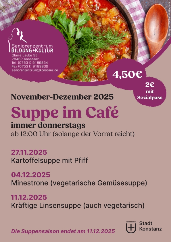 Da die Teilnehmerzahl begrenzt ist, ist eine Anmeldung im Seniorenzentrum Bildung + Kultur, Telefon: 07531 9189834 oder seniorenzentrum@konstanz.de unbedingt erforderlich.