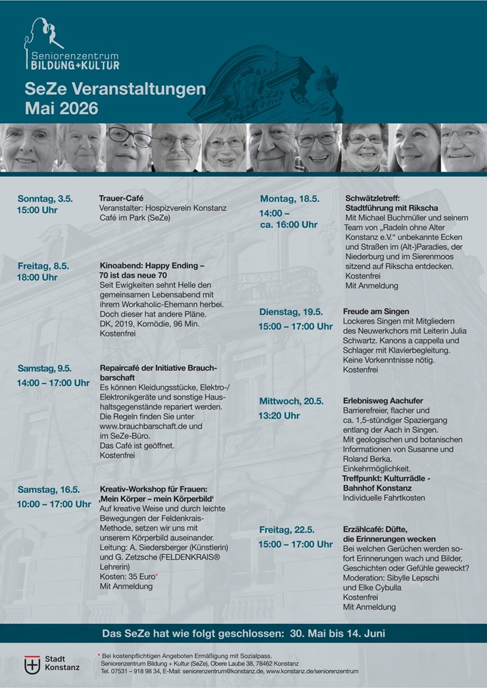 Um Anmeldung zu einzelnen oder allen Terminen wird gebeten. E-Mail: Seniorenzentrum@konstanz.de oder Tel.: 07531-9189834.