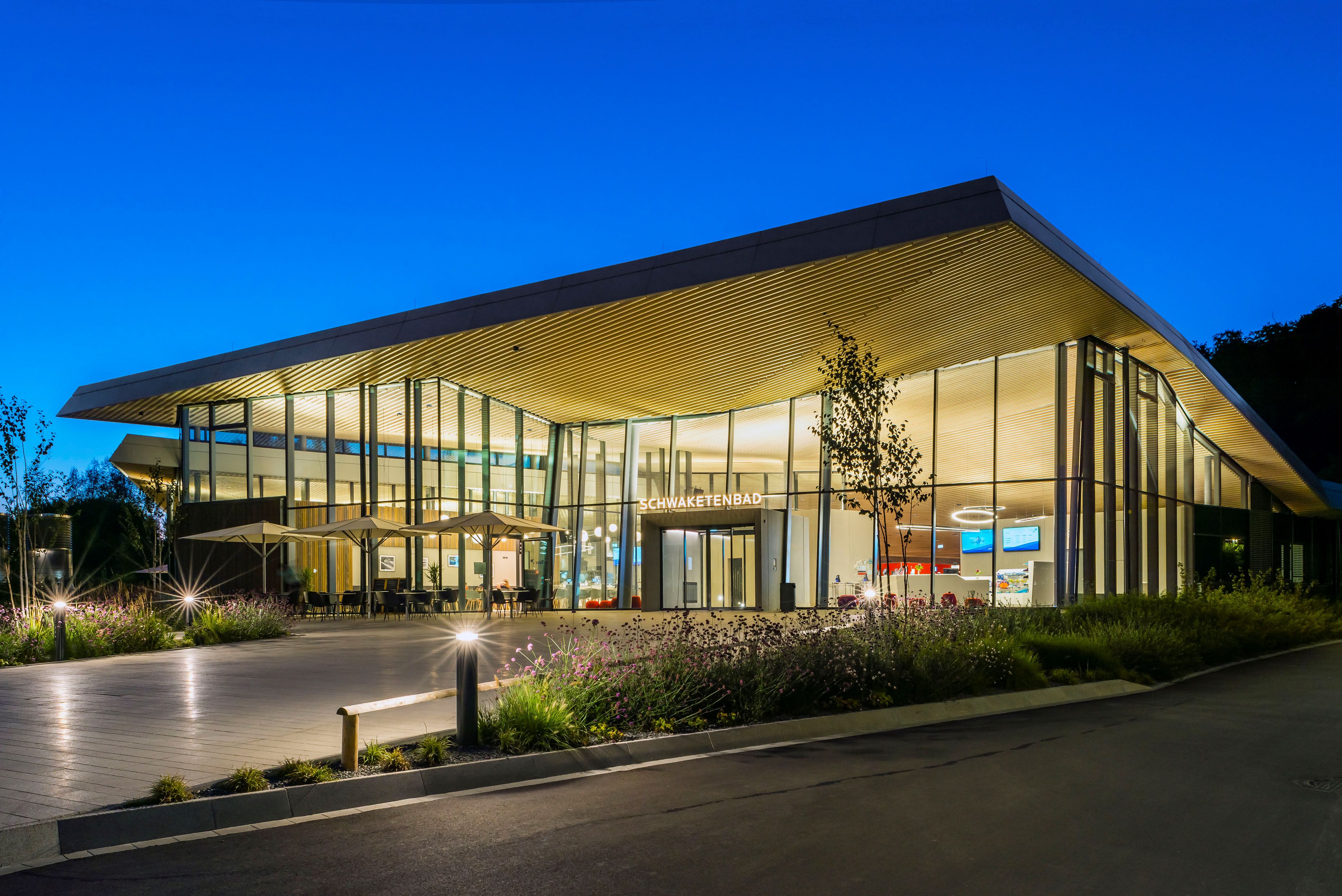 Das Schwaketenbad ist ein modernes, sehr großzügig geschnittenes Bad mit deutlich größeren Flächen als im alten. So gibt es ein zweites 25-Meter-Schwimmer- und ein Kursbecken. Dazu kommen das Nichtschwimmer-Becken, ein großer Wasserspielplatz, ein Kleinkinder-Becken, die Sprunganlage mit Becken und der große Rutschenturm. Für eine kurze Auszeit bietet das Schwaketenbad einen Entspannungsbereich mit Warmbecken. Hier befinden sich außerdem eine Dampfsauna, ein Infrarotlicht-Raum sowie Ruheliegen. Das Restaurant hat einen getrennten internen Bereich und einen externen, der außerhalb der Öffnungszeiten genutzt werden kann.