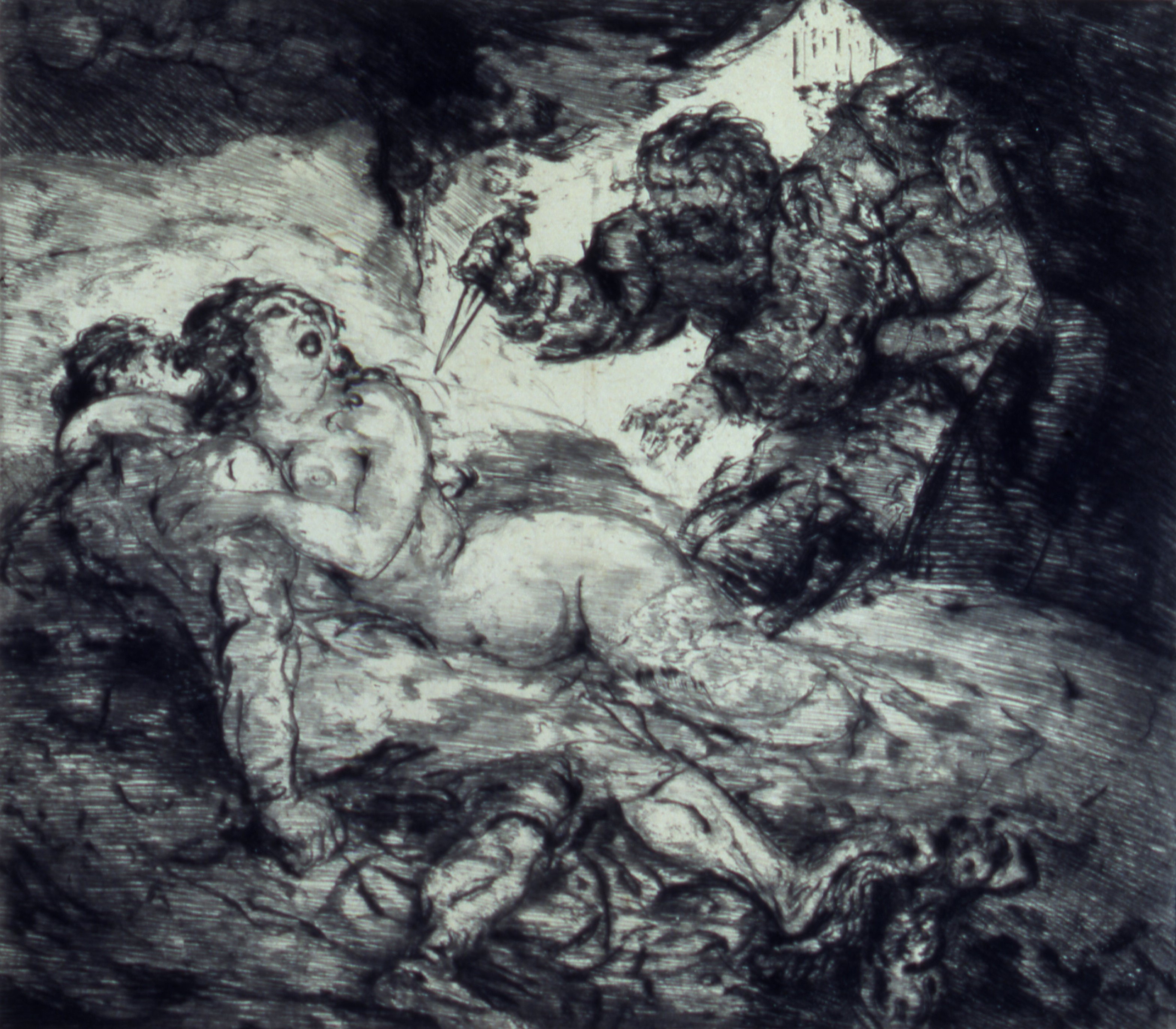 Meid griff in seinen frühen Radierungen die gesamte Bandbreite des impressionistischen Themenkanons auf. Auffallend ist jedoch sein Interesse für Aktdarstellungen. Meist sind es dramatische Szenen, die zwischen Eros und Gewalt changieren, die ihn inspirierten. Eingespannt ins enge Geviert des Blattes zeigt er wie in „Venusberg“ oder „Leda“ orgiastisch ineinander verschlungene Leiber. Aber auch das jähe Umschlagen von Lust in Gewalt („Die Ehebrecherin“) oder das unverhohlen Bedrohlich-Übergriffige gelangt in Blättern wie „Hades und Persephone“ und „Susanne im Bad“ zur Darstellung. Meids sinnliches Licht- und Schattenspiel lässt die nackten Körper leuchten, unterstreicht deren Bewegungen und steigert die den Szenen innewohnende Erregung.