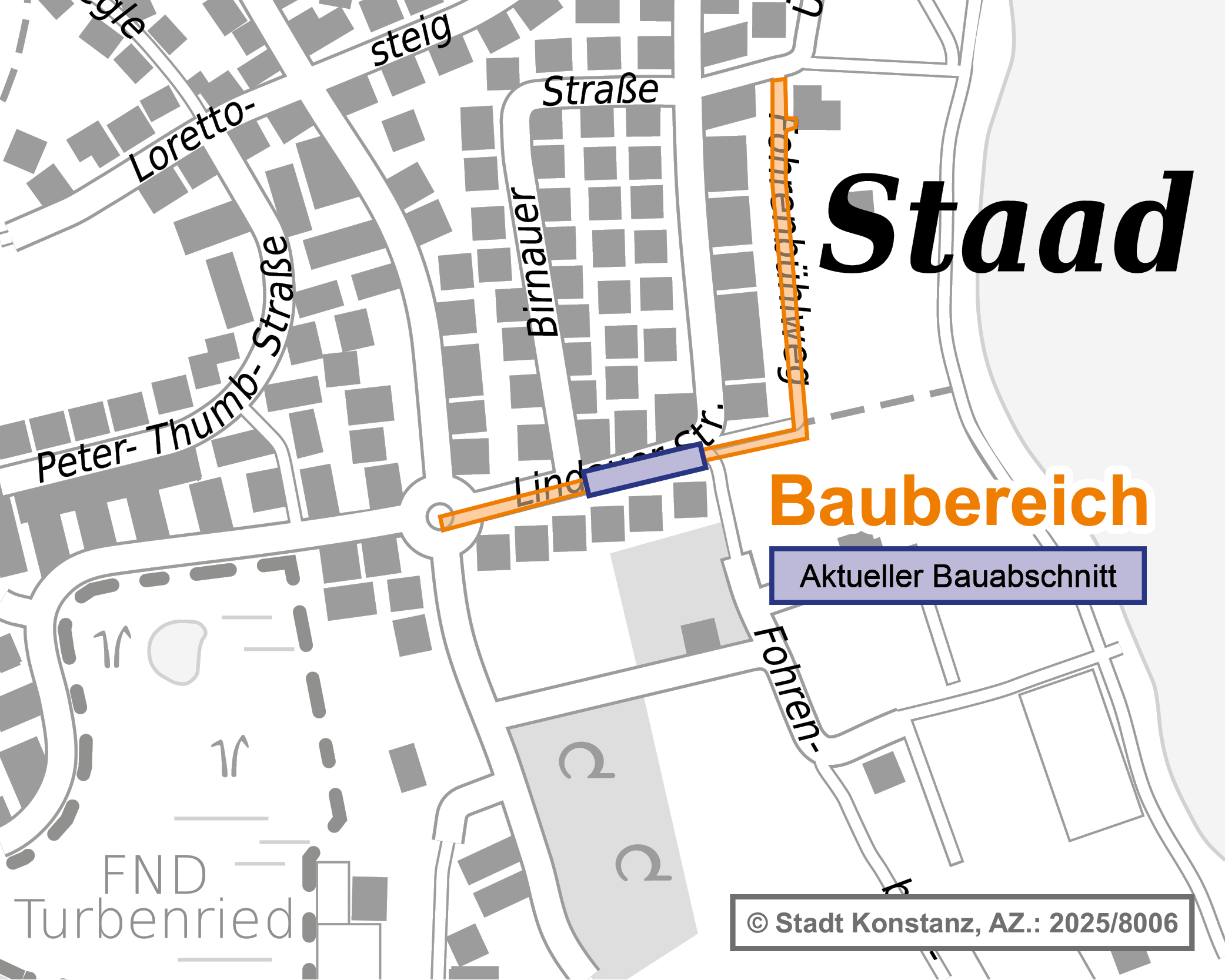 Dieser erste Bauabschnitt wurde kurzfristig verlegt: Die Erneuerung der Druckleitung beginnt nun in der Lindauer Straße, im Abschnitt zwischen dem Container-Standort an der Ecke Fohrenbühlweg bis zur Einmündung Birnauer Straße.