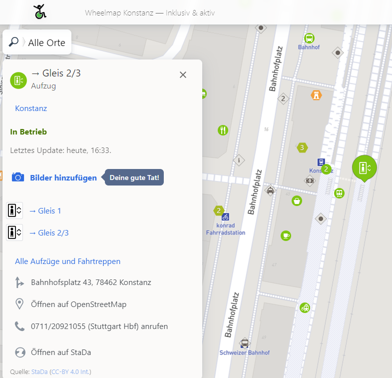 Ein großer Vorteil: Alle AnwenderInnen können sich beteiligen und selbst Informationen ergänzen. Außerdem können Orte hinsichtlich ihrer Barrierefreiheit bewertet und Fotos hochgeladen werden. So wird die Karte ständig aktualisiert und mit realitätsnahen Daten gefüllt – für ein barrierefreies Konstanz, das von der Gemeinschaft gestaltet wird.
