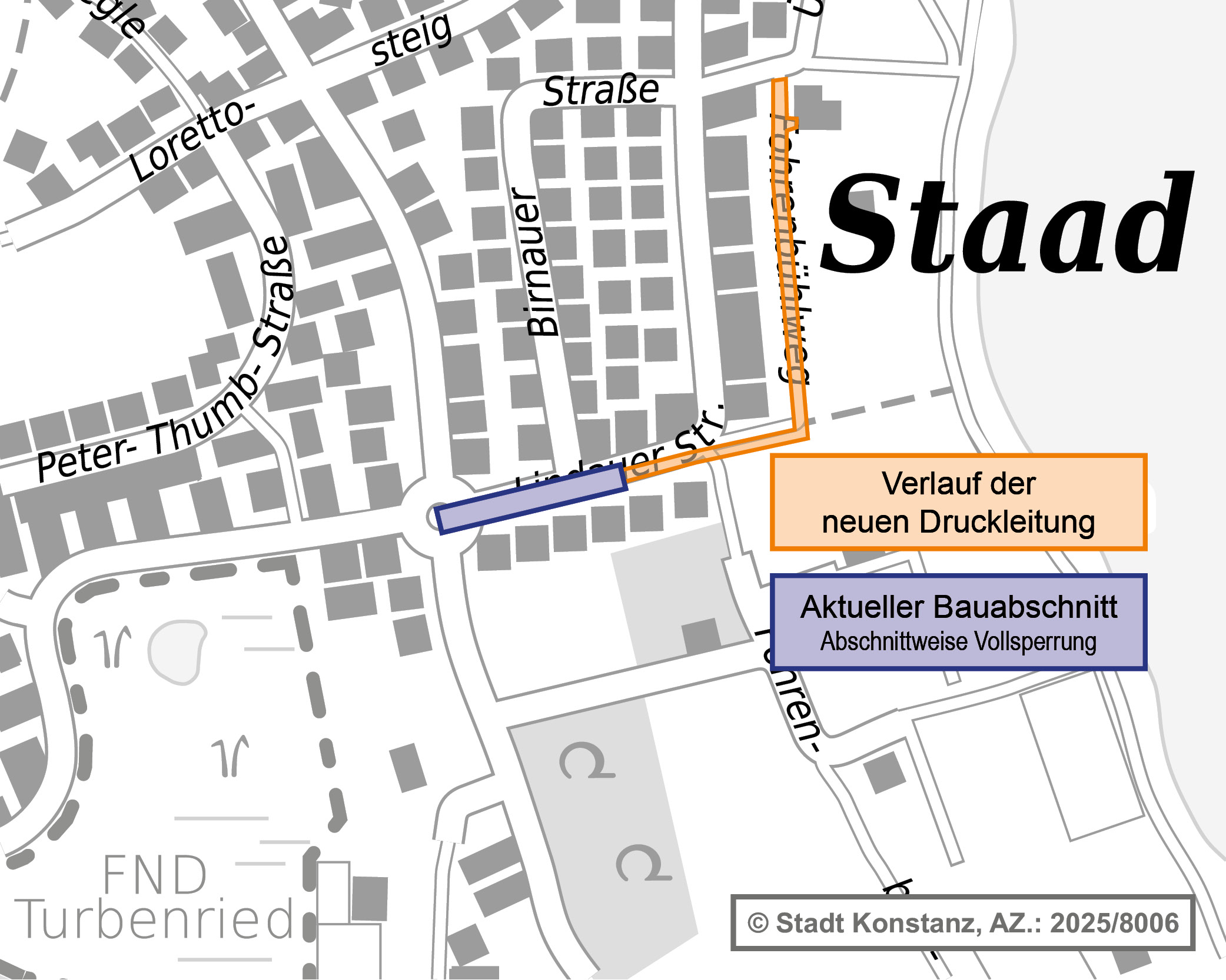 Die Druckleitung Fohrenbühl wird im Auftrag der Entsorgungsbetriebe Stadt Konstanz (EBK) aktuell auf einer Gesamtlänge von ca. 420 Metern erneuert. Die Leitung führt das Abwasser vom Pumpwerk Fohrenbühl am Hörlepark in Konstanz Staad bis zum Kreisverkehr Lindauer Straße, Jakobstraße und Hermann-von-Vicari-Straße. Die Erneuerung ist notwendig, um die zuverlässige Abwasserableitung langfristig zu gewährleisten. Die Arbeiten laufen seit Juni und werden voraussichtlich Ende November abgeschlossen.