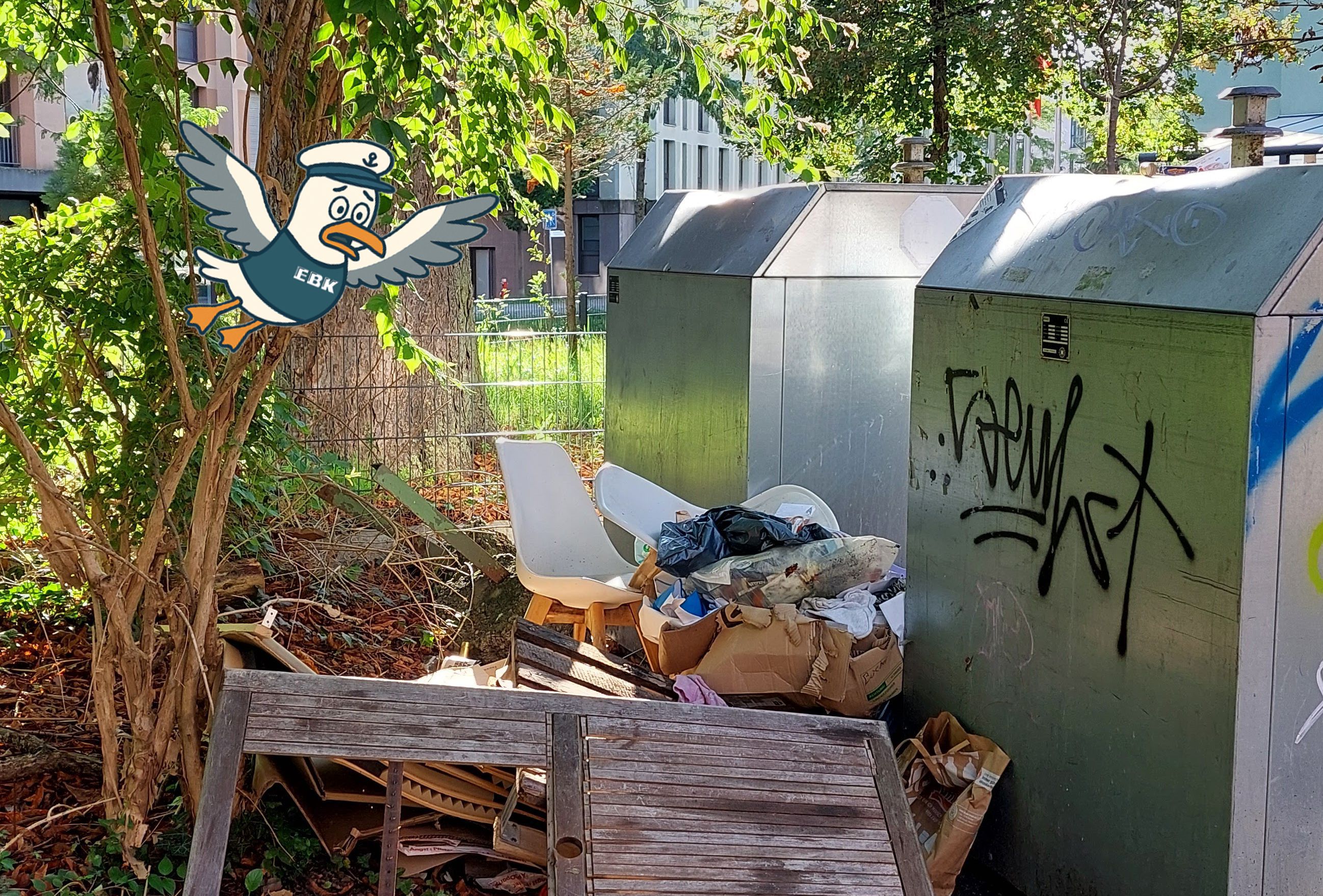 Neben dem regulären Reinigungsdienst reagieren die EBK auch auf Meldungen über größere Müllberge, die zum Beispiel über den Mängelmelder bei den EBK eingehen. Wenn die Meldungen mit Foto eingereicht werden, hilft das sehr bei der kommenden Einsatzplanung. Denn rund um manch einen Container liegt so viel Müll, dass er von einer Person nicht mehr abtransportiert werden kann. Dann müssen nicht nur zusätzliche Kolleginnen und Kollegen, sondern auch größere Fahrzeuge zum Einsatz kommen. Entsprechende Sonderfahrten lassen sich meist nur freitags und mit entsprechendem zeitlichem Vorlauf organisieren. Sie sind zeit- und kostenaufwendig. Und ehrlich gesagt, sind sie auch nervig, da diese Zusatzarbeit aufgrund der Bequemlichkeit einzelner Personen notwendig wird.