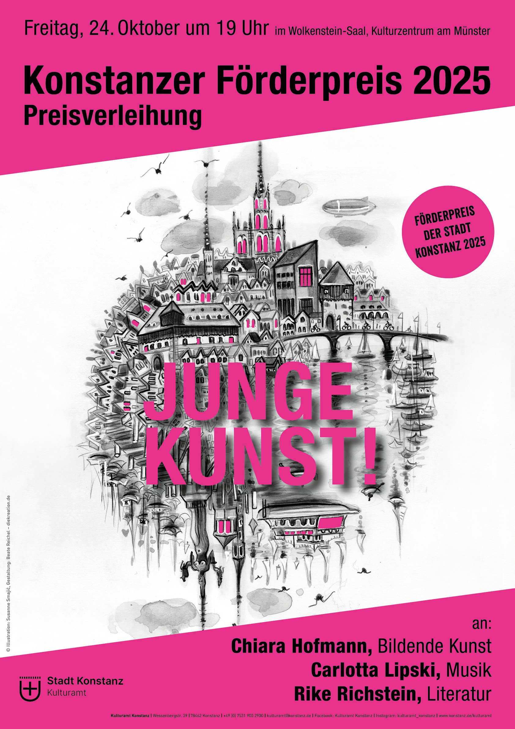 Die Stadt Konstanz vergibt alle zwei Jahre einen Förderpreis für junge Künstlerinnen und Künstler 35 Jahre in den Sparten Musik, Bildende Kunst und Literatur.
