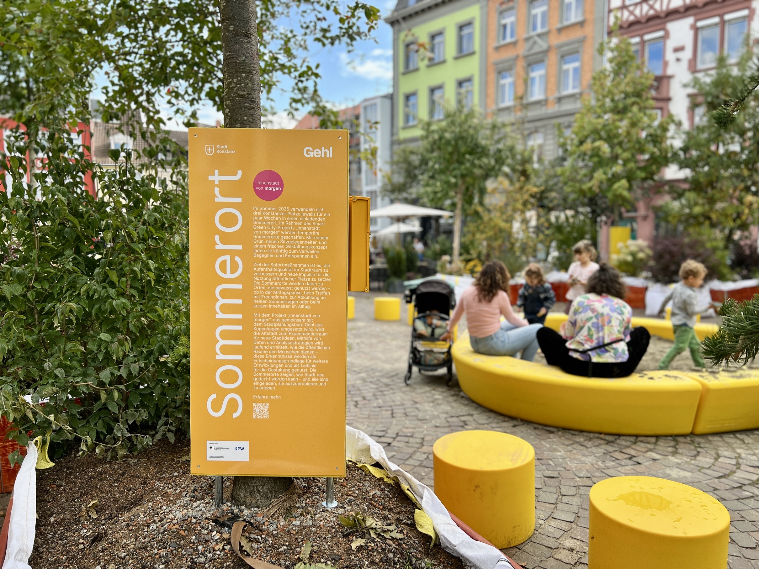 Der Sommer 2025 hat gezeigt, wie viel Potenzial in der Konstanzer Innenstadt steckt, wenn Freiräume neu gedacht werden. Im Rahmen des Smart Green City-Projekts „Innenstadt von morgen“ wurden der Pfalzgarten, Augustinerplatz und Bodanplatz für einige Wochen zu sogenannten Sommerorten.Die temporären Gestaltungen luden dazu ein, neue Nutzungsideen auszuprobieren und gemeinsam zu erleben, wie nachhaltige Stadtentwicklung konkret vor Ort aussehen kann. Im Pfalzgarten entstand eine grüne Oase mitten in der Stadt: Sitzmöbel und Kräuterbeete luden zum Verweilen, Beobachten und Mitmachen ein. Auf dem Augustinerplatz wurde die Aufenthaltsqualität in einem Teilbereich verbessert – neue Sitzgelegenheiten und ein mobiles Wassernebel-Element sorgten an heißen Tagen für angenehme Abkühlung. Der Bodanplatz erhielt durch aufgestellte Bäume, Großsträucher und ein Spielelement in der Platzmitte eine temporäre Begrünung und wurde neu belebt. Die Sommerorte folgen dem Konzept des taktischen Urbanismus: Mit einfachen Mitteln schnell sichtbare Verbesserungen im Stadtraum testen. Dadurch können Wirkungen beobachtet, Erfahrungen gesammelt und die Menschen aktiv in die Entwicklung ihrer Stadt einbezogen werden. Die Umfragen mit BürgerInnen und BesucherInnen haben wertvolle Rückmeldungen ergeben. Am Augustinerplatz kam besonders die freundliche Gestaltung mit dem gelben Mobiliar gut an: „Das macht gute Laune und lädt zum Verweilen ein.“ Im Pfalzgarten wurde geschätzt, dass „so viele unterschiedliche Menschen den Platz nutzen – zum Ausruhen auf der Liege, zum Mittagessen, zum Lernen …“.Die Rückmeldungen und Beobachtungen aus dem Sommer liefern wertvolle Erkenntnisse für die Zukunft: knapp 700 Meinungen, Bewertungen und Impulse fließen nun in die weiteren Planungen ein. Sie sind Grundlage für eine klimaresiliente, lebendige und zukunftsfähige Innenstadt von morgen. Mehr Informationen zu den Sommerorten gibt es unter smart-green-city-konstanz.de/sommerorte