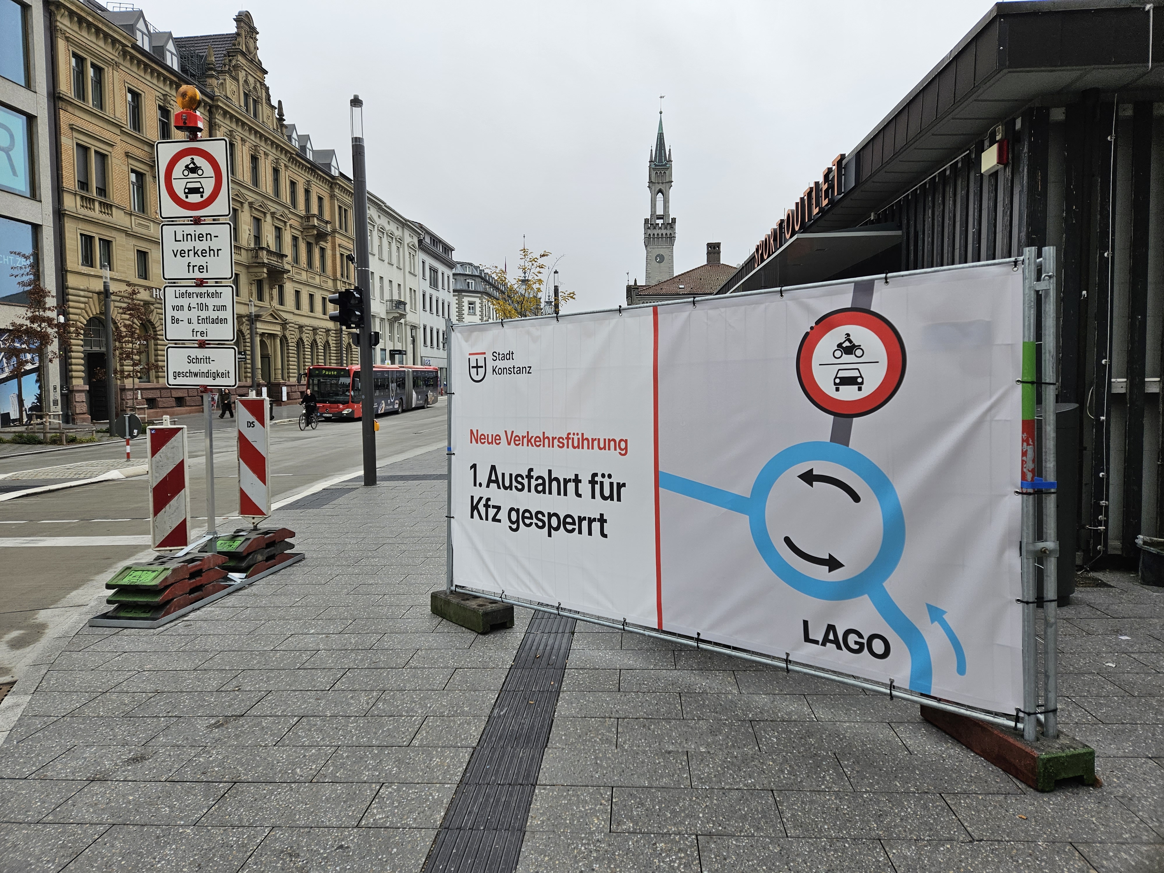 Zur besseren Orientierung wurde die Position der Schilder zur Verkehrsführung und den geltenden Verkehrsregelungen überarbeitet. Die Beschilderung ist nun übersichtlicher angeordnet, besser im Blickfeld der Autofahrenden platziert und wird zusätzlich durch drei Banner ergänzt, die großflächig und frühzeitig auf die geänderte Verkehrsführung