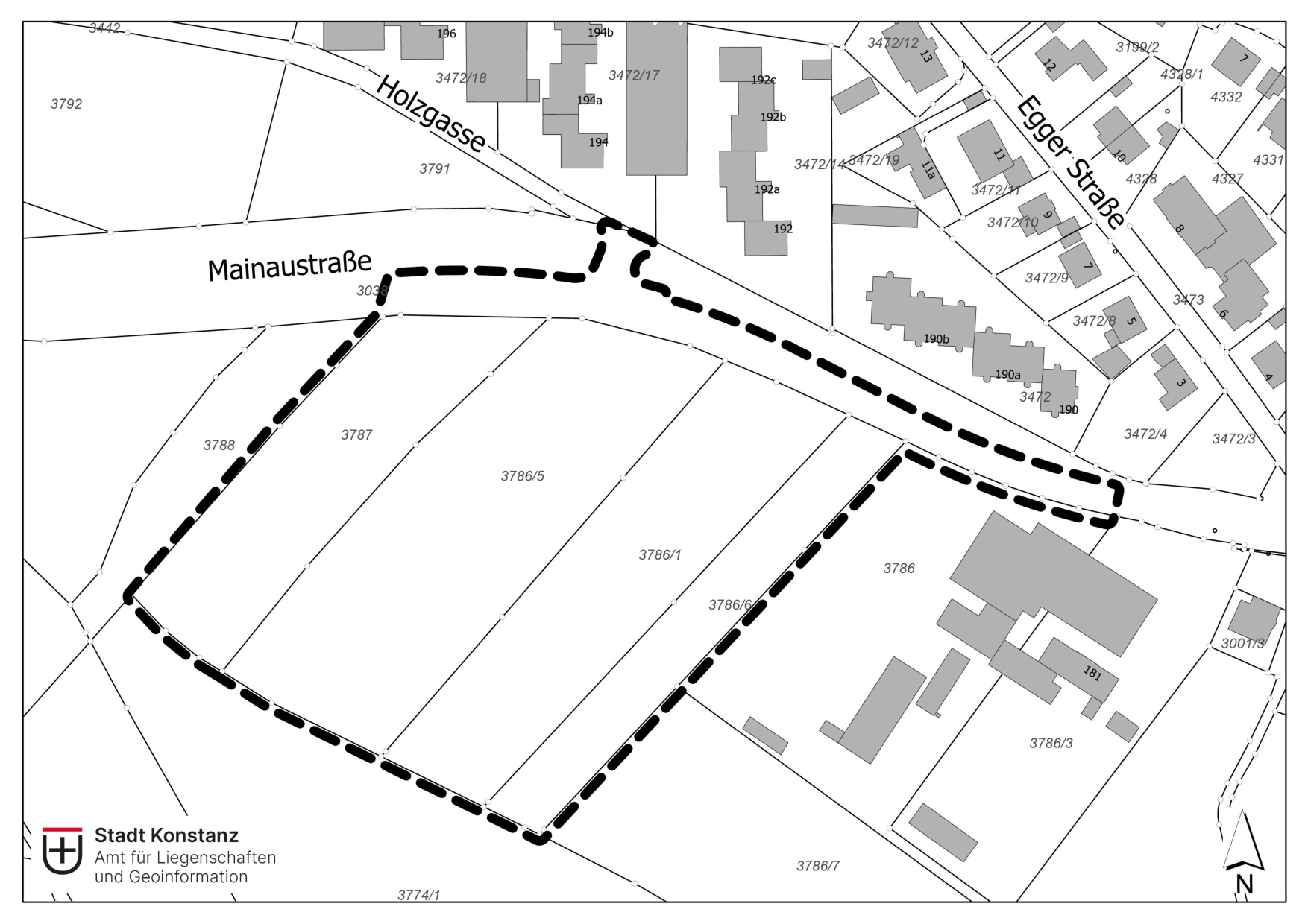 Er umfasst die Flurstücke Nr. 3786/1, 3786/5, 3786/6, 3787 (teilweise) sowie Teile der Flurstücke Nr. 3038 (Mainaustraße) und ein Teil des Flurstücks Nr. 3786 der Gemarkung Konstanz.