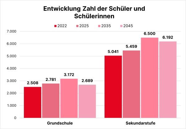 Auch für die weiterführenden Schulen wird bis 2040 ein erheblicher Zuwachs an SchülerInnen erwartet, bevor die Zahlen allmählich sinken. Der Höchststand wird bei etwa 6.620 SchülerInnen liegen und einen erhöhten Bedarf an Klassenräumen und -zügen bedingen.