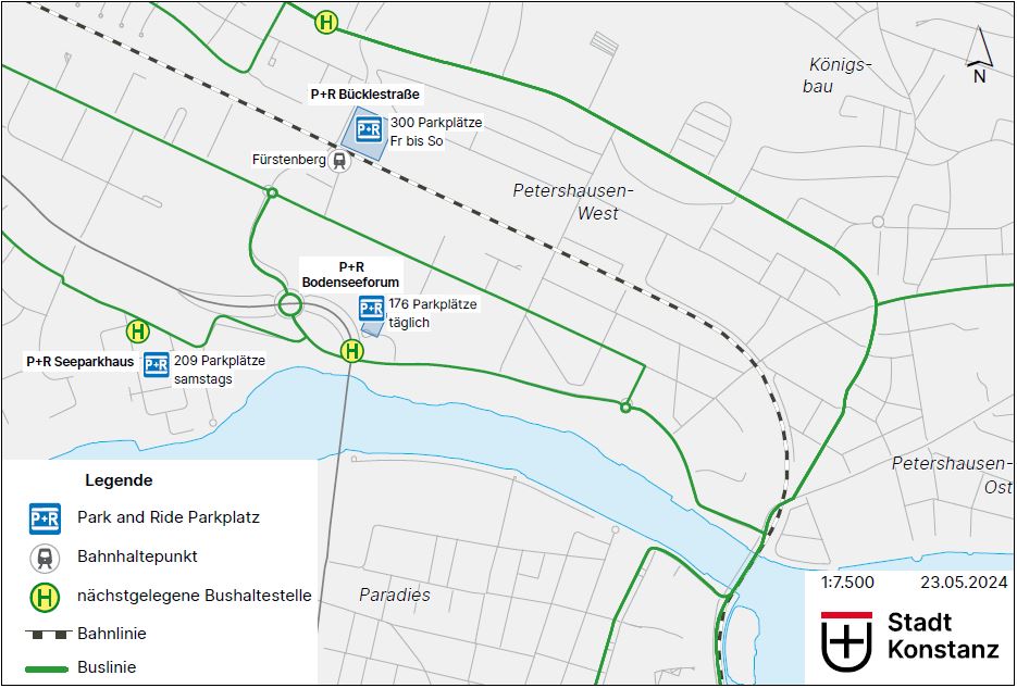 Zwei neue P+R-Parkplätze ergänzen ab sofort das Parkangebot außerhalb der Innenstadt. Das ist zum einen eine Parkfläche an der Bücklestraße, dort kann freitags ab 9 Uhr bis sonntags um 24 Uhr kostenfrei geparkt werden. Außerhalb dieser Zeiten ist der Parkplatz über eine Schranke gesperrt. Ab der Bushaltestelle Fürstenberg kommt man mit den Linien 2, 3, 12 und 12/3 in die Innenstadt. Alternativ ist man direkt am Bahnhaltepunkt Fürstenberg und von dort in zwei Stationen an Hauptbahnhof. Die Konstanzer Bustickets gelten auf dieser Strecke. Eine weitere neue Parkmöglichkeit ist im Parkhaus „Seepark“ in der Line-Eid-Straße. Hier kann samstags geparkt und mit dem dort vorweg gelösten Parkticket der Bus genutzt werden.