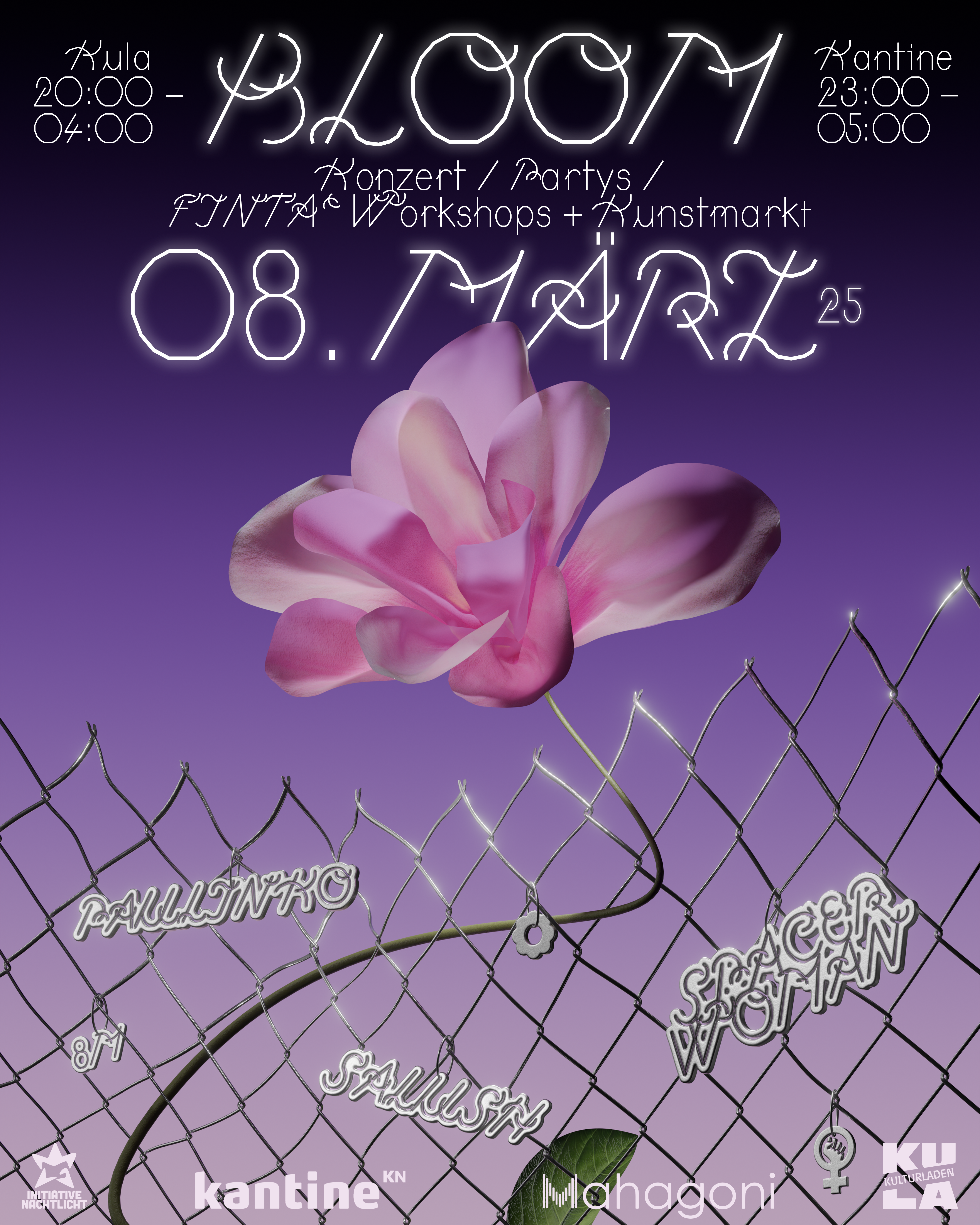 Der Abend beginnt um 20 Uhr im KULA mit einem Live-Konzert von Paulinko, das die Bühne für musikalische Vielfalt eröffnet. Im Anschluss laden zwei Partys zum Feiern ein: Ab 22 Uhr im KULA und ab 23 Uhr in der Kantine. Alle drei Events stehen ganz im Zeichen von FINTA*-Künstlerinnen, die mit Live Musik und DJ-Sets für einen runden Abschluss des internationalen Frauentags sorgen.