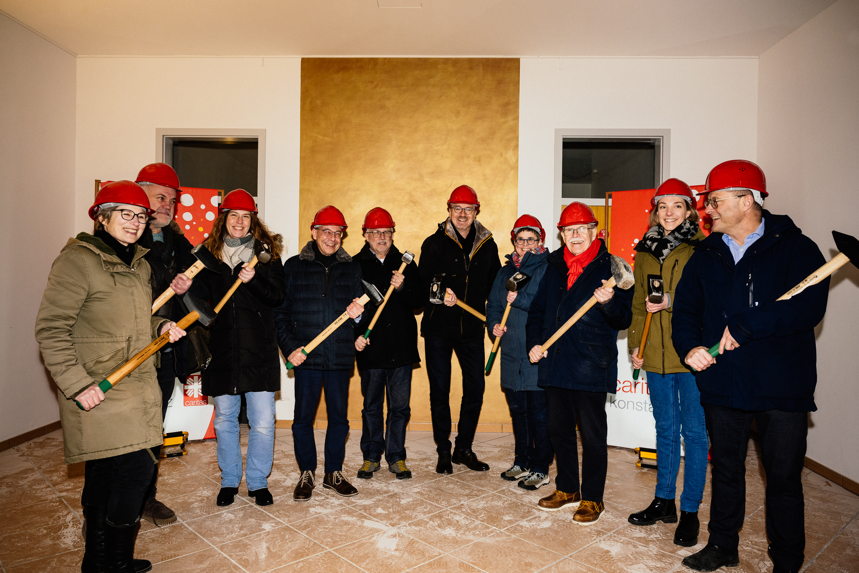 Neben Eigenmitteln der Caritas ist der Umbau nur durch ein umfangreiches und günstiges Darlehen der Katholischen Kirchengemeinde Konstanz sowie durch das Wohnraumförderungsprogramm des Landes Baden-Württemberg möglich. Beim symbolischen Spatenstich am 17. Januar dankte der Caritas-Aufsichtsratsvorsitzende Wolfgang Müller-Fehrenbach der Kirchengemeinde Konstanz und blickte auf die Geschichte des Marienhauses zurück: „Nach dem Bau im Jahr 1866 wohnten hier zunächst sogenannte Dienstmädchen, die keine Bleibe hatten oder nicht mehr arbeiten konnten. Im Jahr 1966 wurde es zum Seniorenheim und blieb bis 2023 ein wichtiger Treffpunkt im Quartier.“ Oberbürgermeister Uli Burchardt sagte: „Es freut mich, dass wir gemeinsam mit der Caritas im freigewordenen Marienhaus eine einmalige Chance nutzen: In diesem schönen Konstanzer Haus entsteht neben bezahlbarem Wohnraum für Pflegekräfte und inklusiven WGs auch dringend benötigter Platz für die Ganztagsbetreuung der Wallgutschule. Danke an alle, die das möglich gemacht haben!“