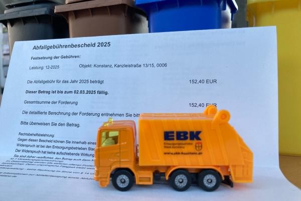 Die Entsorgungsbetriebe Stadt Konstanz (EBK) versenden ab Ende Januar 2025 den jährlichen Abfallgebührenbescheid. Aufgrund gestiegener Personal- und Entsorgungskosten müssen die Gebühren 2025 um rund 3,3 % erhöht werden. Das bedeutet konkret, dass die jährliche Abfallgebühr eines vierköpfigen Haushalts statt 222,00 Euro nun 229,20 Euro beträgt. Eine Übersicht über die Höhe der Jahresgebühr in Gegenüberstellung zum Vorjahr ist auf der Website der EBK in der Rubrik Abfallgebühren zu finden.