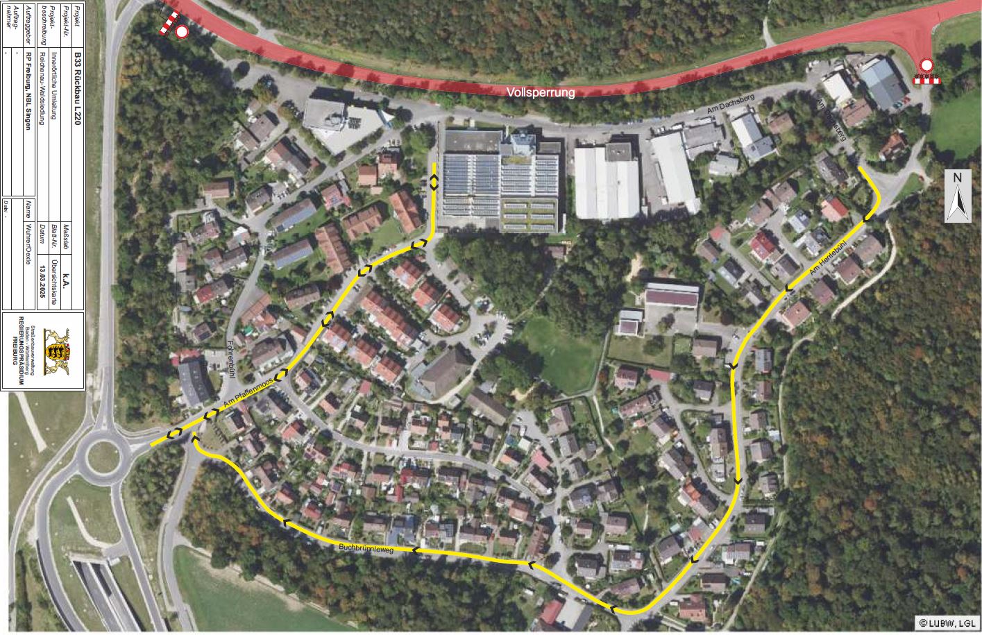Der Verkehr mit Ziel Gewerbegebiet wird in einer Ringführung durch die Siedlung geleitet. Die Umleitung wird ausgeschildert (siehe Lageplan anbei).