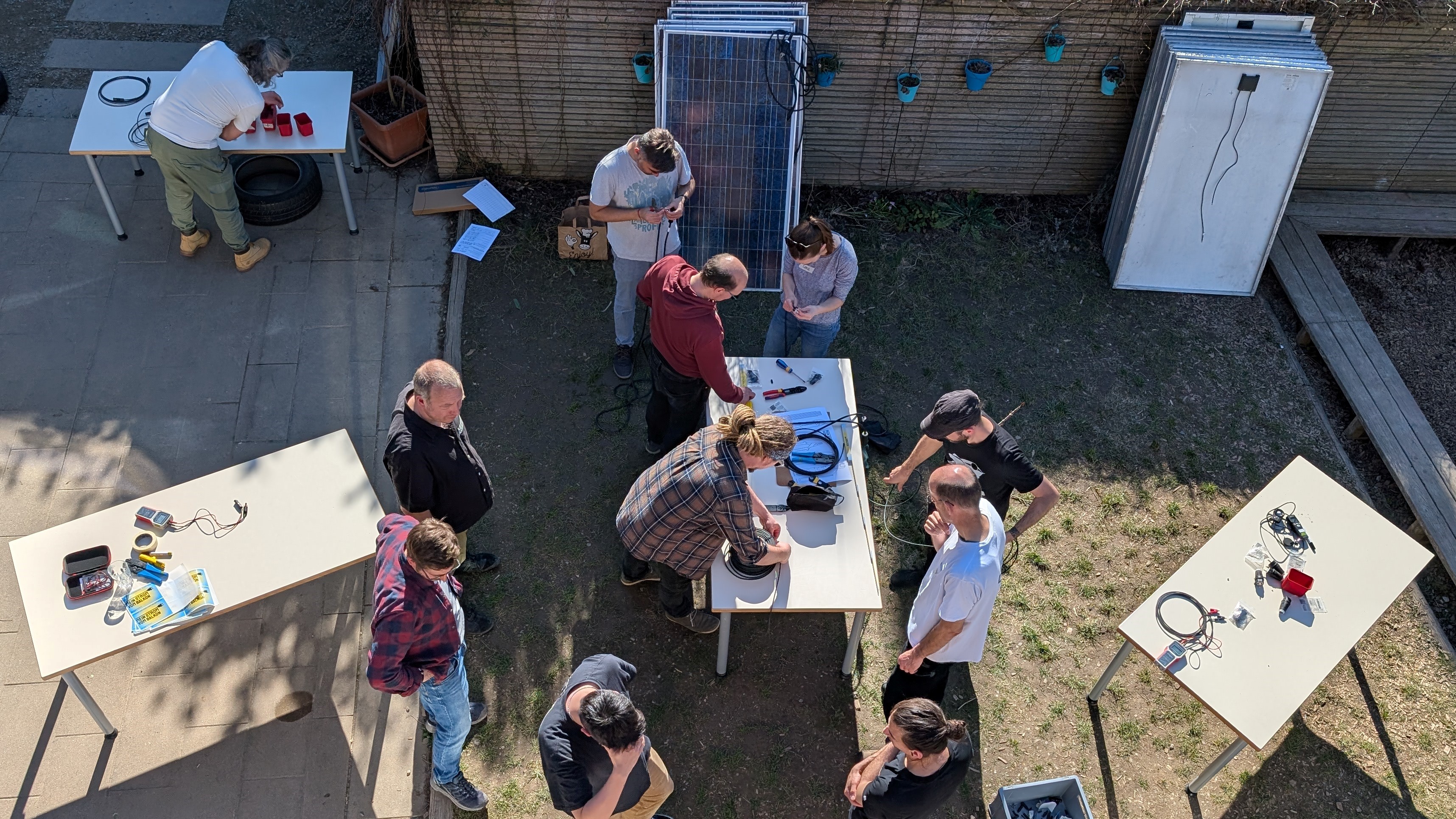 Auf die Theorie folgte die Praxis: die Teilnehmenden testeten die ausrangierten PV-Modulen auf ihre Leistungsfähigkeit. Hierzu wurde die aktuelle Sonneneinstrahlung mit der tatsächlich erzeugten Leistung verglichen. Noch funktionstüchtigen Module lassen sich nach einer Umrüstung mit neuen Steckern und einem Wechselrichter für Steckersolargeräte erneut nutzen. Die verschiedenen Befestigungsmöglichkeiten wurden vorgestellt, sodass die Teilnehmenden die Module später eigenständig montieren können.