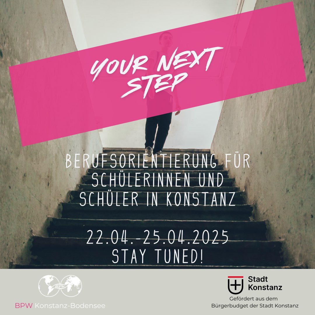 Wer noch nicht sicher ist, welcher Beruf zu einem passt, für den ist das Berufsorientierungsprojekt "Your next step - dein Weg in die Zukunft!" eine Chance. Es bietet die Möglichkeit, verschiedene Berufe praxisnah kennenzulernen. 30 SchülerInnen der Klassen 8 bis 10 der Konstanzer Schulen können mitmachen. Sie besuchen spannende Unternehmen, erhalten exklusive Einblicke in den Arbeitsalltag und tauschen sich direkt mit Profis aus. Zusätzlich lernen sie in einem Social-Media-Training, wie man sich online selbstbewusst präsentiert. Weitere Infos und Anmeldung unter: www.bpw-konstanz.de