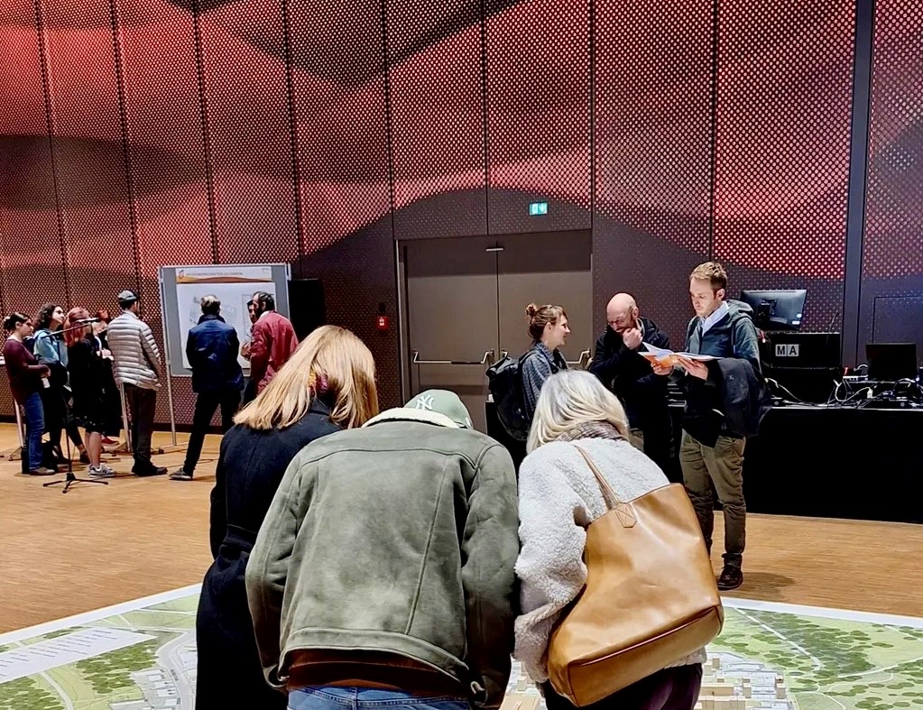 Im Anschluss konnten die Teilnehmenden an Thementischen individuelle Fragen zu Vergabeverfahren für Reihenhäuser und zu bezahlbarem Bauen stellen. Ein großformatiger Plan des neuen Stadtteils im Maßstab 1:200 mit beweglichen Baumodulen ermöglichte eine interaktive Auseinandersetzung mit dem Quartier.