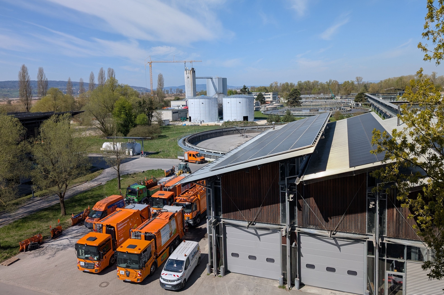 Es ist nicht zu übersehen: Solarstrom spielt für die Entsorgungsbetriebe Stadt Konstanz (EBK) eine wichtige Rolle. Nicht nur auf dem markanten Schrägdach des Betriebsgebäudes sind zahlreiche Photovoltaik (PV)-Module installiert. Auch auf dem Betriebsgelände der Kläranlage sind viele Flächen und Dächer mit entsprechenden Modulen belegt. Im Jahr 2024 haben die EBK auf ihrem Gelände 262 MWh Solarstrom produziert: Ausreichend Energie für etwa Hundert Zwei-Personen-Haushalte, aber noch lange nicht genug für den Betrieb der Kläranlage.
