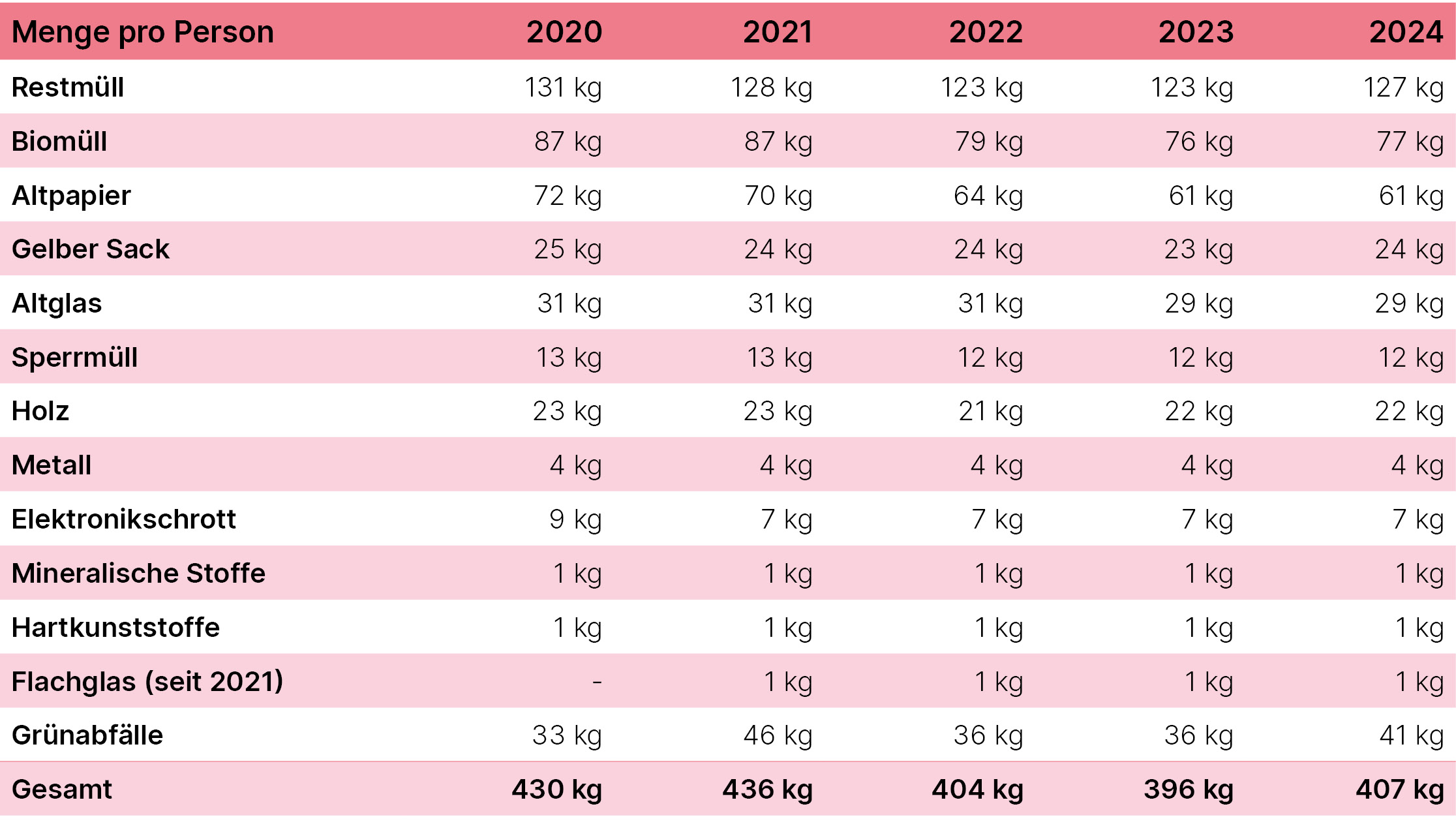 Unter das Altpapier fällt das tatsächliche Papier wie Zeitungen, Zeitschriften, Briefe und Werbeflyer, aber auch Pappe und Kartons wie Versandboxen oder Pakete werden zum Altpapier gezählt. Schließlich wird alles in den meist blauen Tonnen entsorgt. Die Altpapiermenge ist 2024 unverändert bei 61 Kilogramm pro Person. Das ist insofern bemerkenswert, als das Gewicht nicht weiter zurückgeht. Diesen Trend hatten die EBK die vergangenen Jahre beobachtet: Das Gewicht des gesammelten Altpapiers wird weniger, während das Volumen durch mehr, aber leichtere Pappe und Kartons zunimmt. Durch den Versandhandel hat sich in den vergangenen Jahrzehnten der Anteil an Kartons und Boxen vergrößert, während klassische Druckprodukte wie Zeitungen nicht mehr so häufig gedruckt gekauft und anschließend entsorgt werden. Beim Altpapier könnte nun ein Plateau erreicht sein und es wird spannend, wie sich die Menge im Jahr 2025 entwickelt.