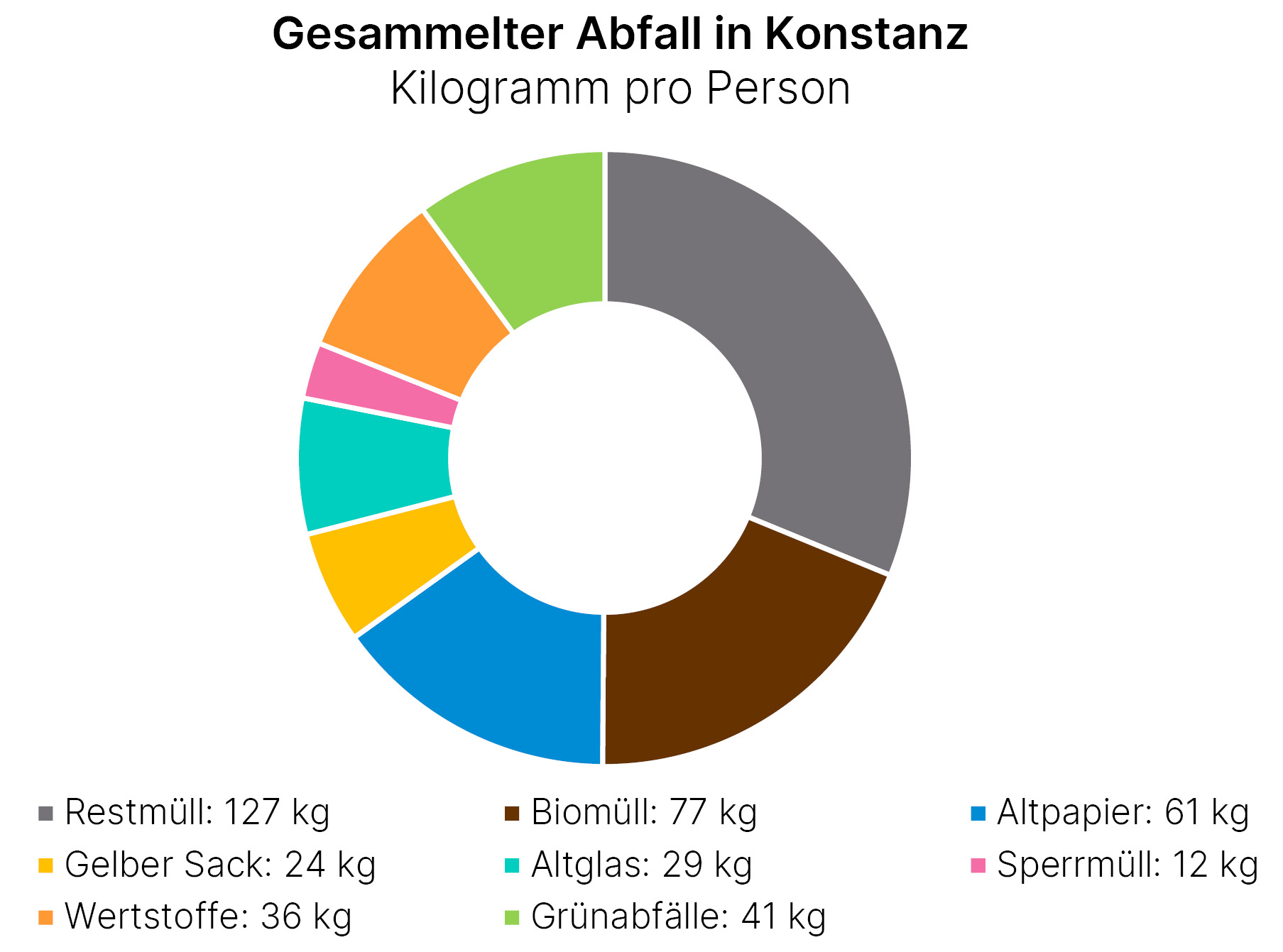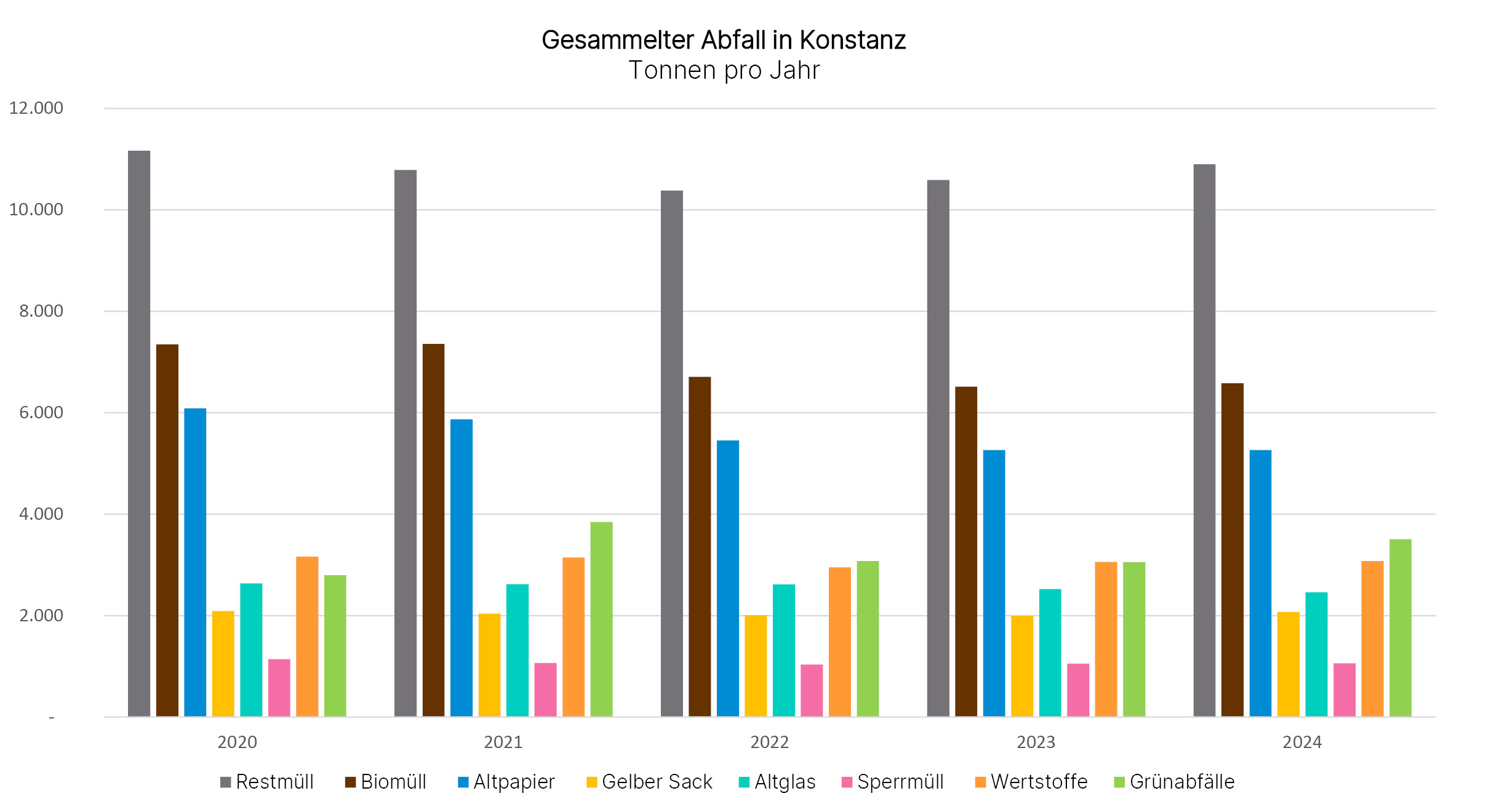 Die Entsorgungsbetriebe Stadt Konstanz (EBK) sind für den Betrieb der Müllabfuhr und der Wertstoffhöfe der Stadt Konstanz und in den dazugehörigen Ortsteilen verantwortlich. Jeden Werktag sind neun Müllfahrzeuge unterwegs, die Biomüll-, Altpapier- und Restmülltonnen leeren oder Gelbe Säcke abholen. Das ist eine Menge Müll! In der Abfallstatistik werfen die EBK einen genauen Blick auf die verschiedenen Abfallarten und wie sich diese Mengen im Vergleich zu den Vorjahren entwickelt haben. Dabei lässt sich schnell feststellen: Der Trend zu weniger Abfall aus den vergangenen Jahren hat sich nicht fortgesetzt, es ist aber auch nicht mehr geworden.