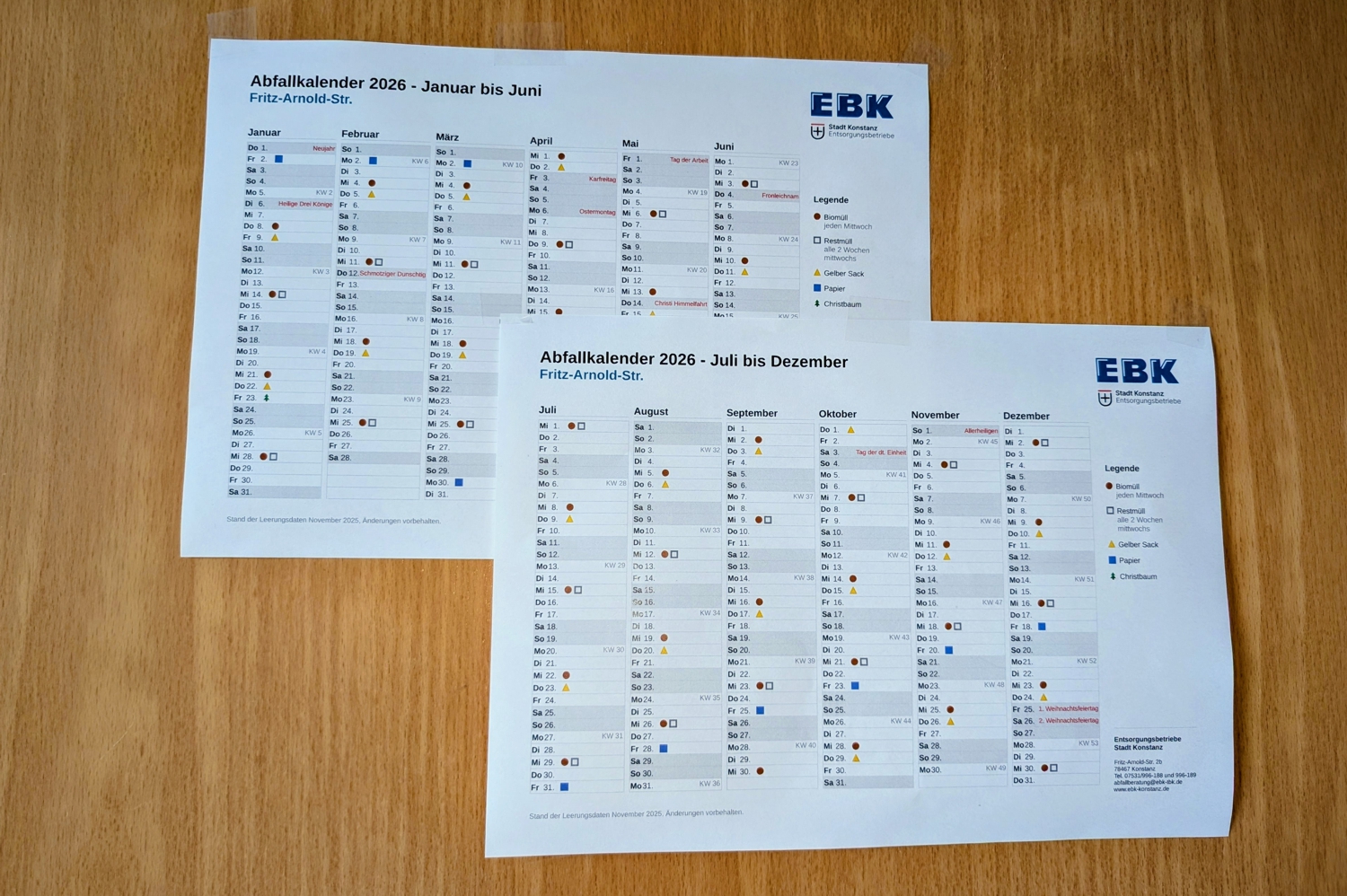 Die Entsorgungsbetriebe Stadt Konstanz (EBK) haben die Vorbereitungen für 2026 weitgehend abgeschlossen: Im online Abfuhrkalender sind die Abfuhrdaten 2026 schon länger verfügbar. Wie gewohnt können sie als Pdf zum Druck und als Ics-Datei für den Import in elektronische Kalender heruntergeladen werden.